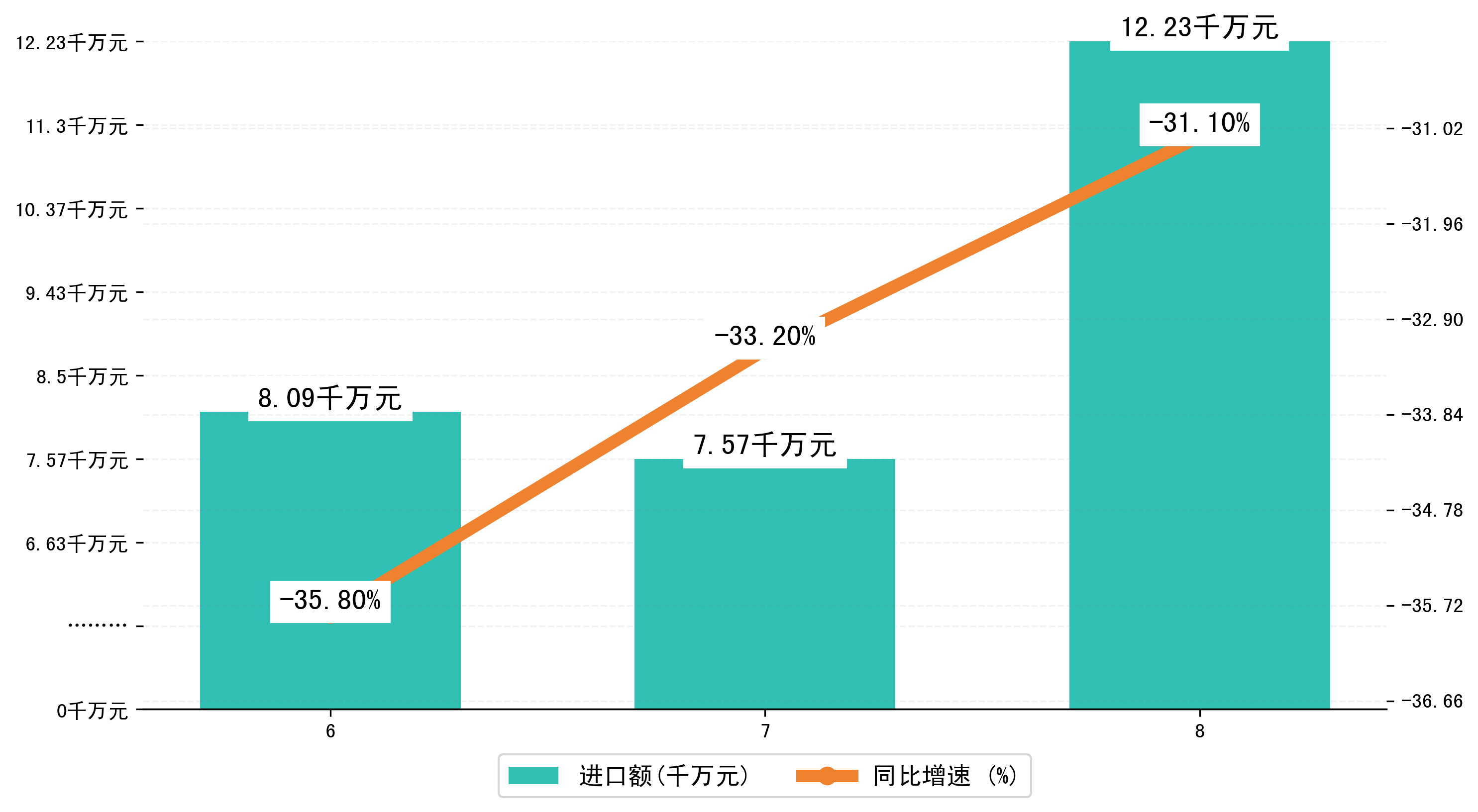 以人民币计,2024年1-8月西宁市进口额为9,5188.818万元,相比上年同期减少了4,1566.5066万元,同比减少了-31.10%。