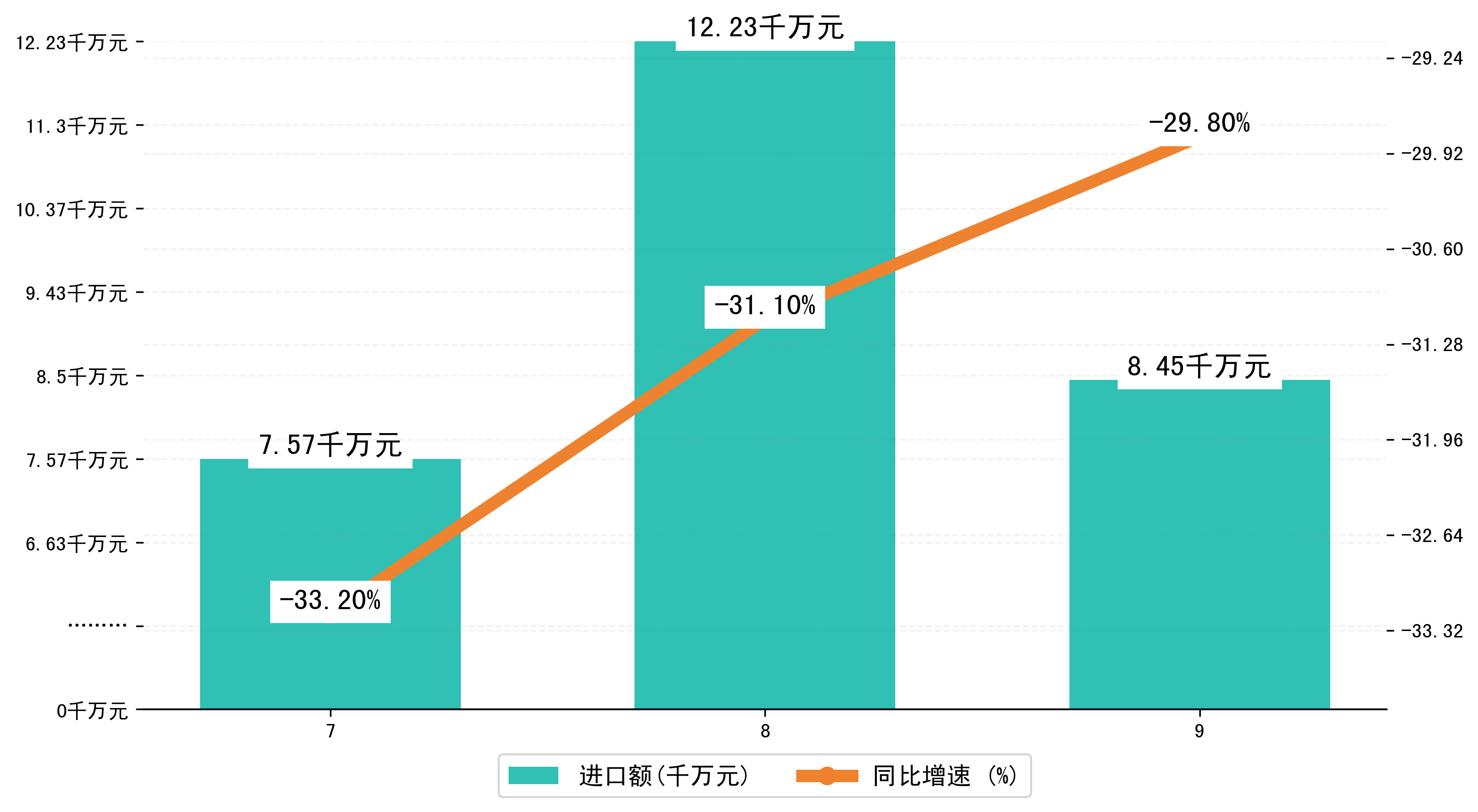 以人民币计,2024年9月西宁市进口额为8445.6407万元,相比上月减少了3787.0361万元;相比上年同期减少了1394.2839万元,同比减少了-29.80%。