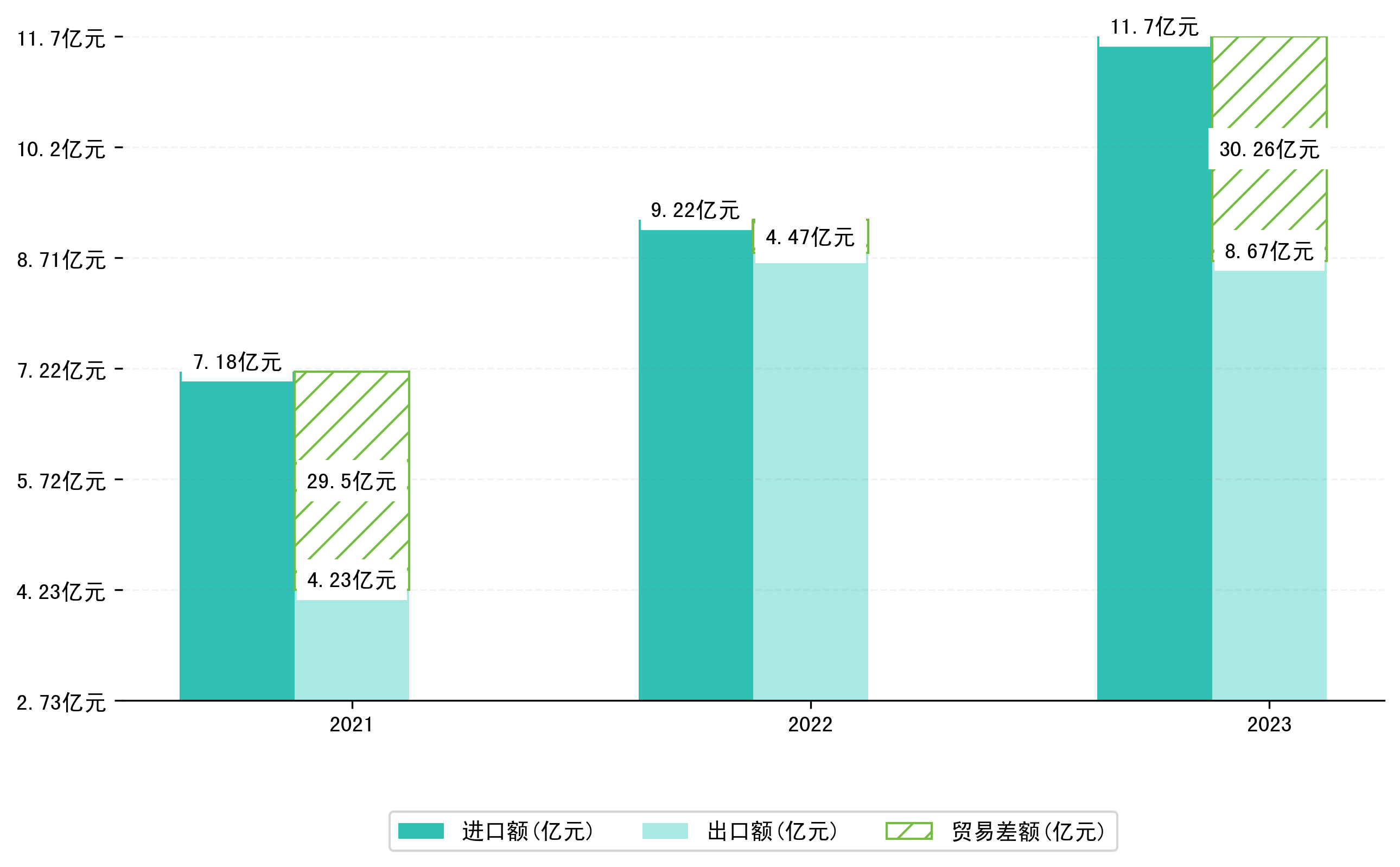 以人民币计,2023年1-6月西宁市贸易差额为3,0256,2836万元(贸易逆差),相比上年同期减少了2,5781,7789万元,同比减少576.19%。