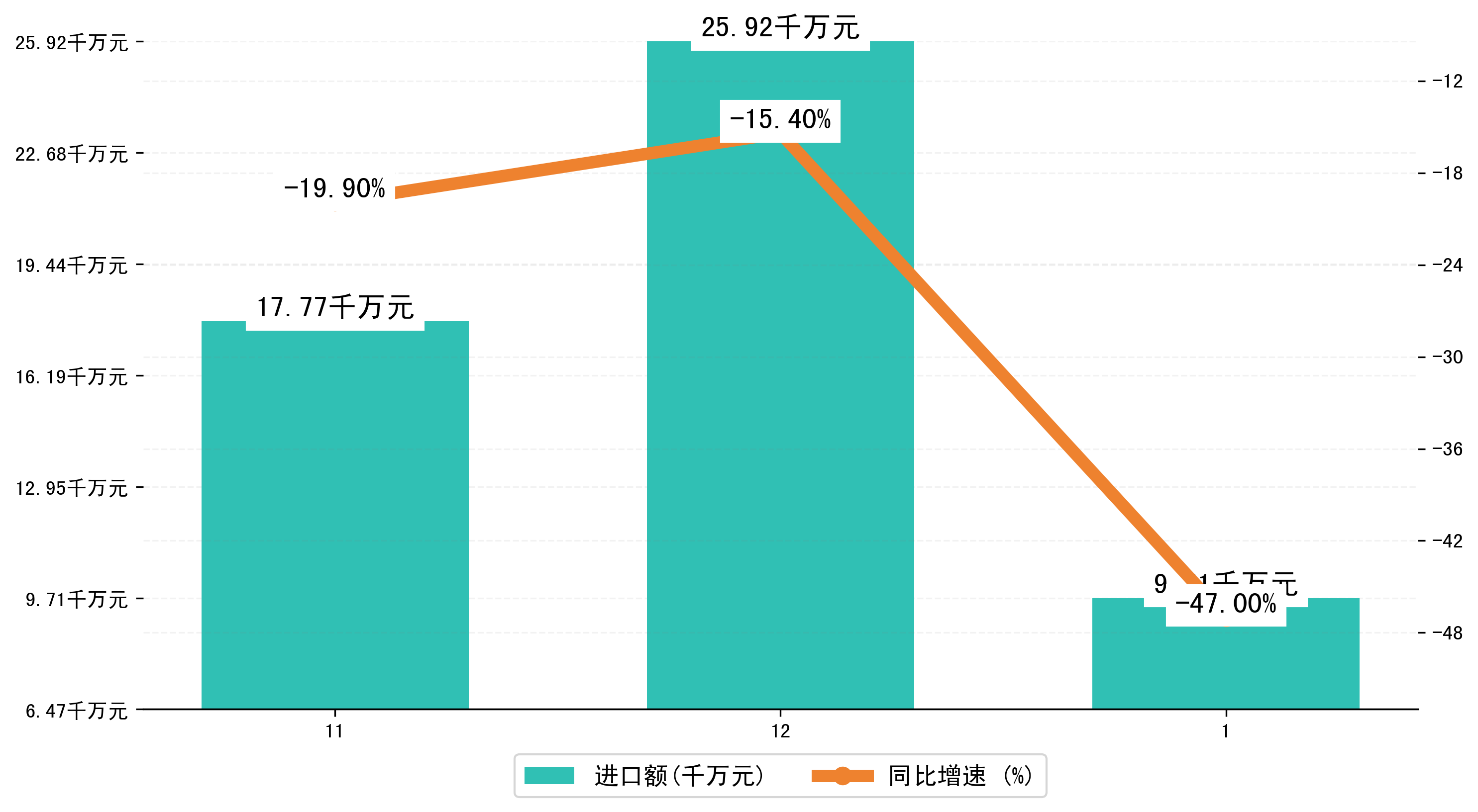 以美元计,2025年1-1月西宁市进口额为1347.4056万美元,相比上年同期减少了1295.7811万美元,同比减少-47.80%。