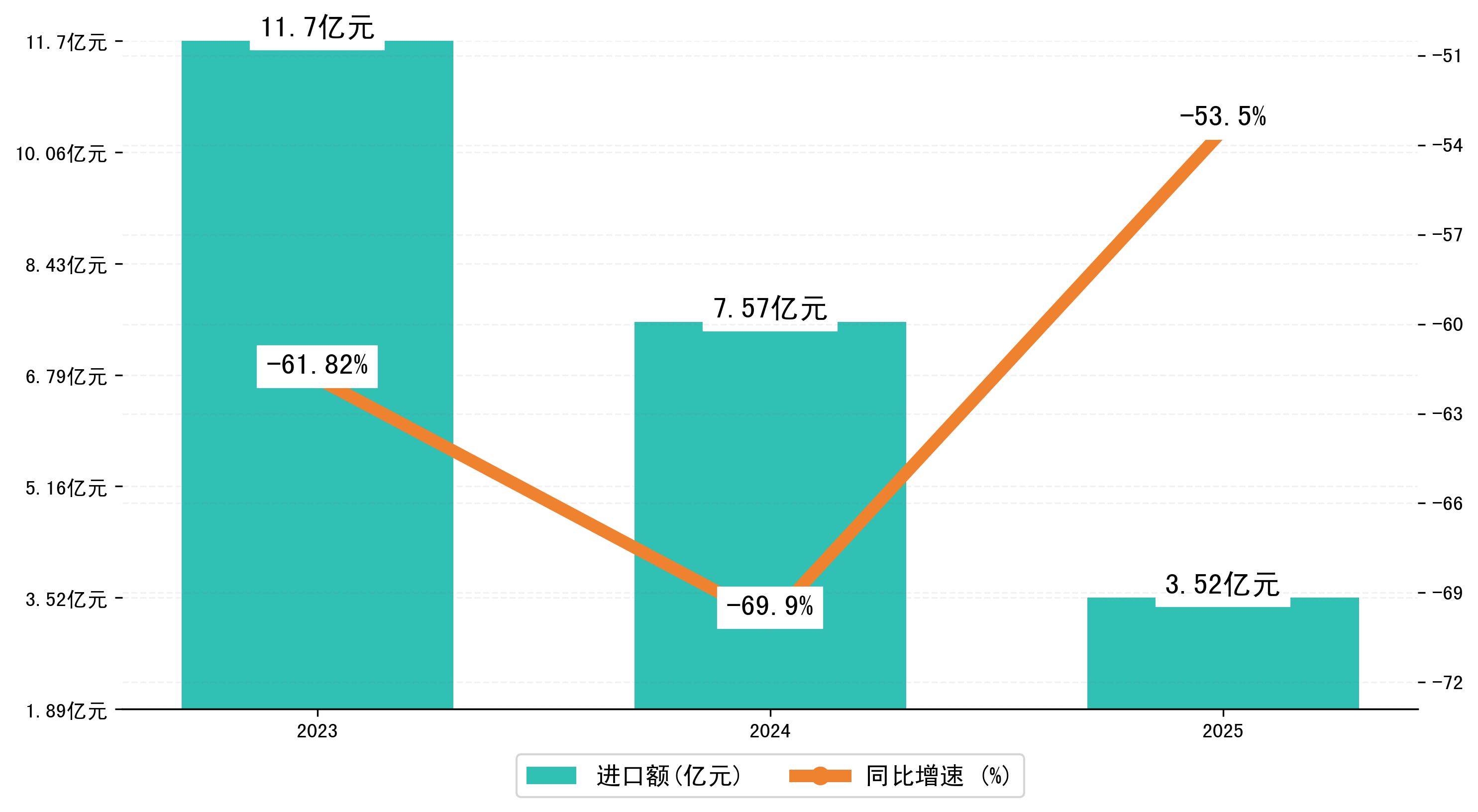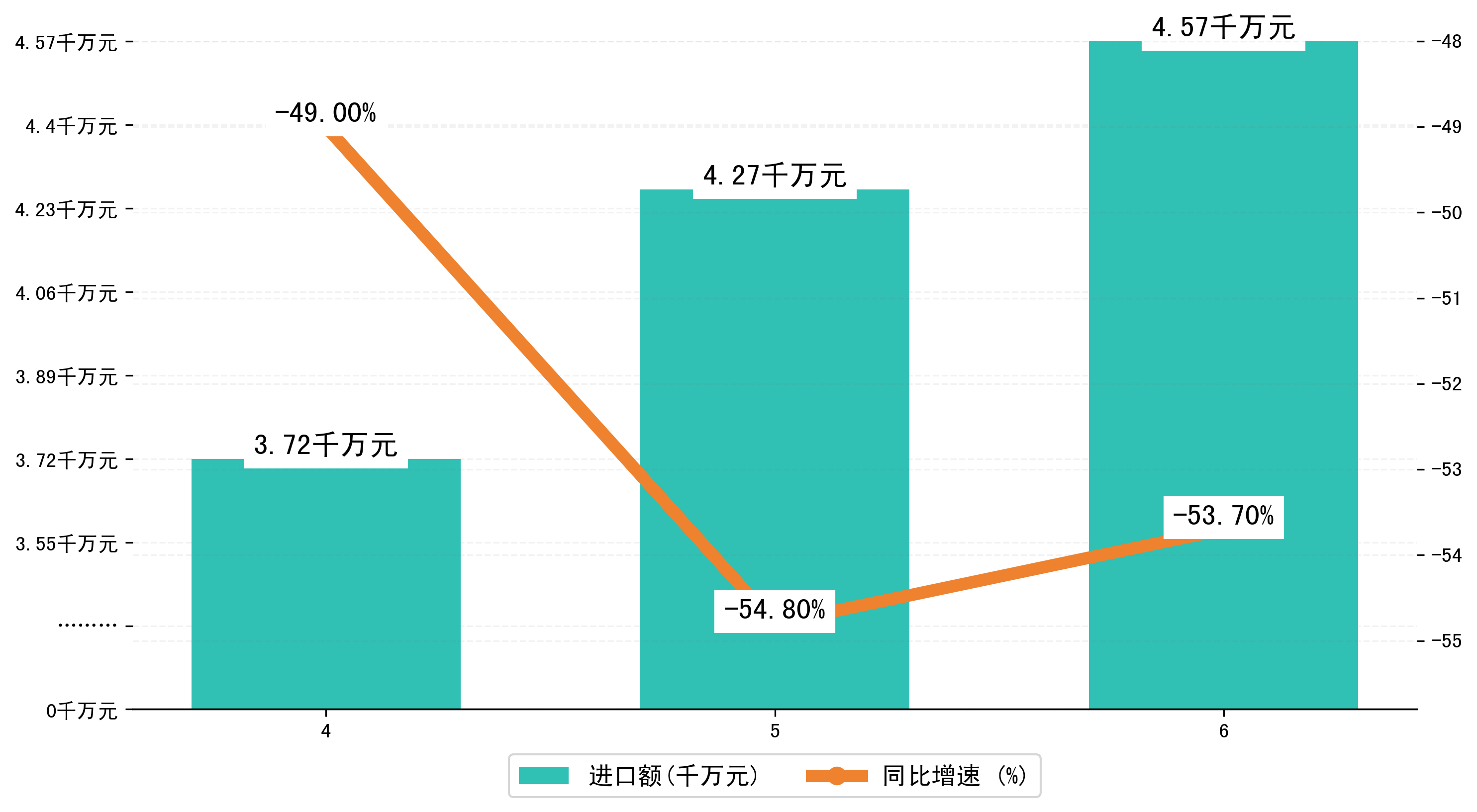 以美元计,2025年1-6月西宁市进口额为4899.5648万美元,相比上年同期减少了5766.5962万美元,同比减少-54.20%。