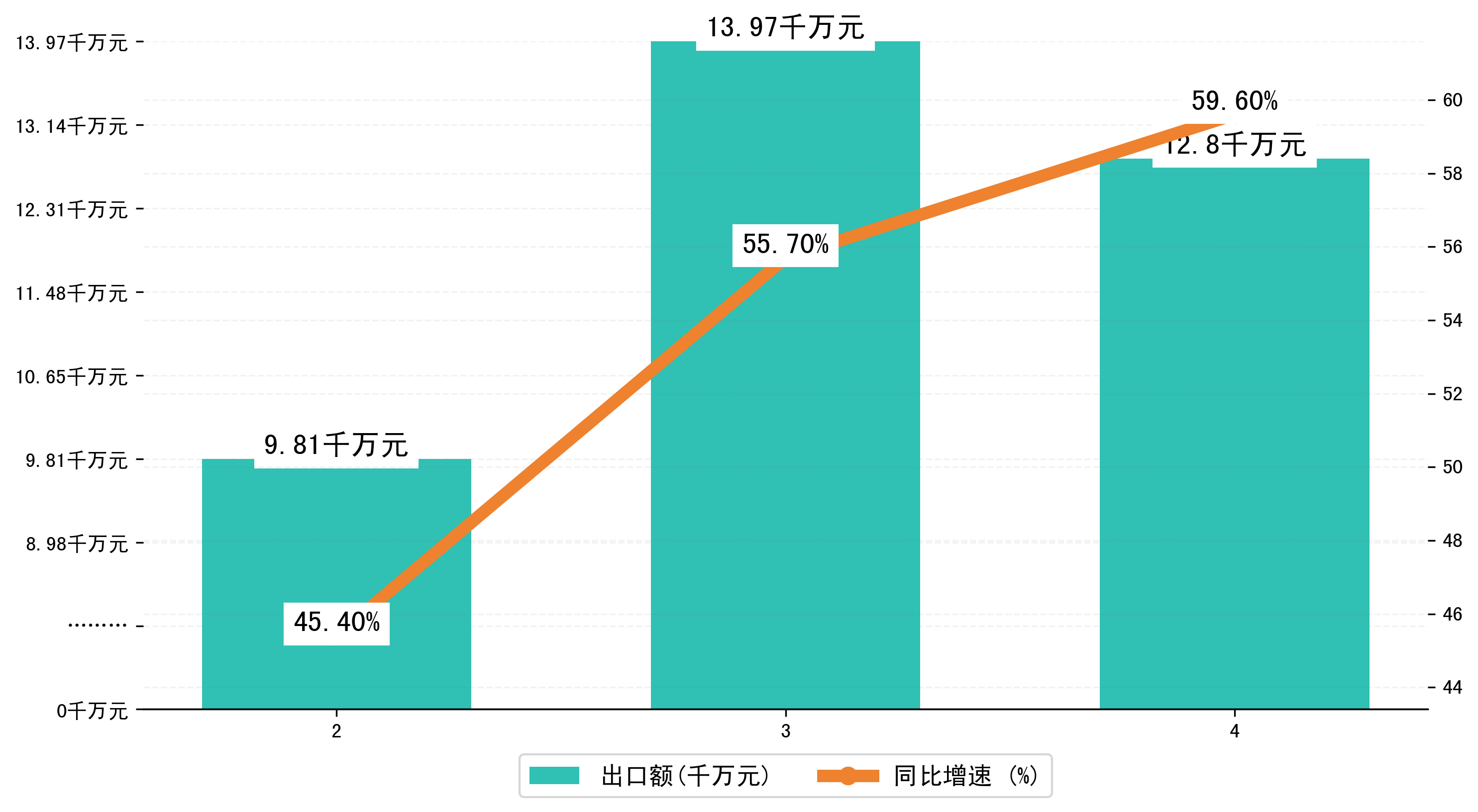 以人民币计,2023年1-4月西宁市出口额为5,7705.0462万元,相比上年同期增加了2,1611.854万元,同比增加了59.60%。