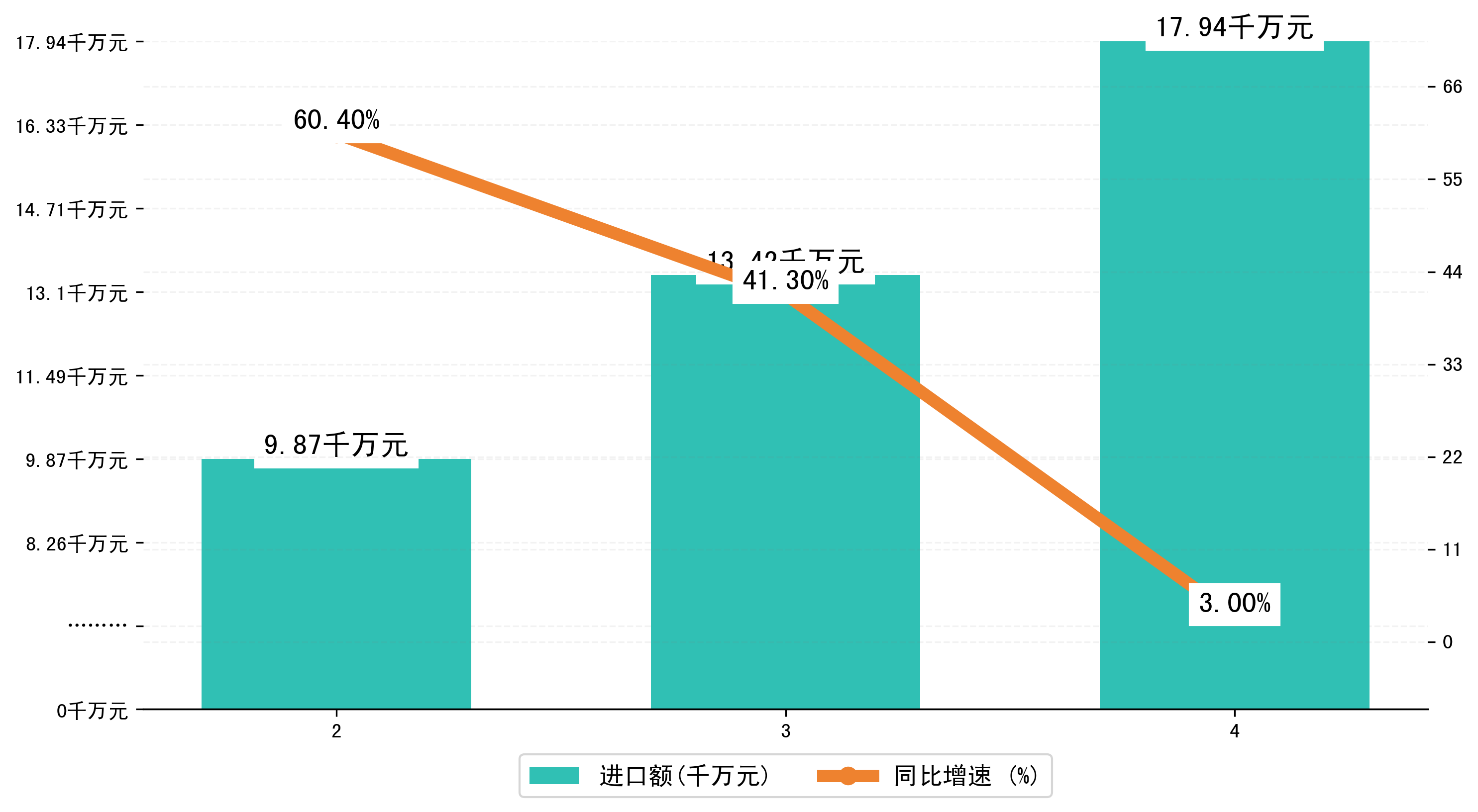 以人民币计,2023年4月西宁市进口额为1,7939.4471万元,相比上月增加了4518.6191万元;相比上年同期减少了1,2348.9809万元,同比增加了3.00%。