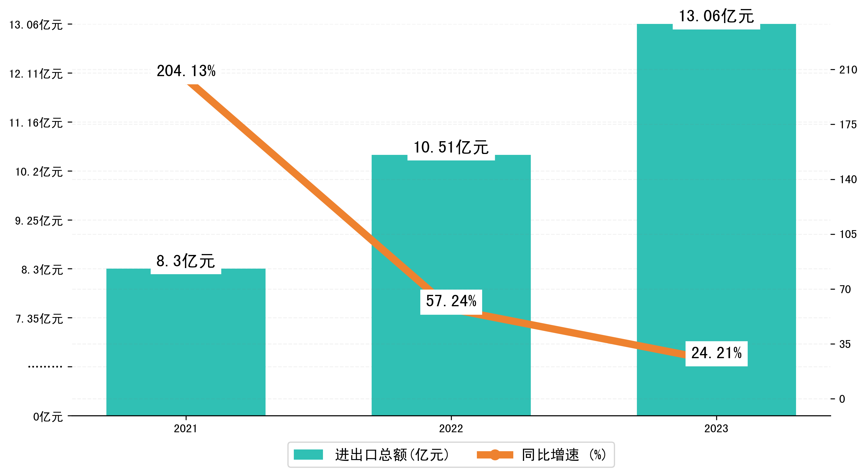 以人民币计,2023年1-4月西宁市进出口总额为13,0565.3594万元,相比上年同期增加了2,5448.1036万元,同比增加了22.10%。