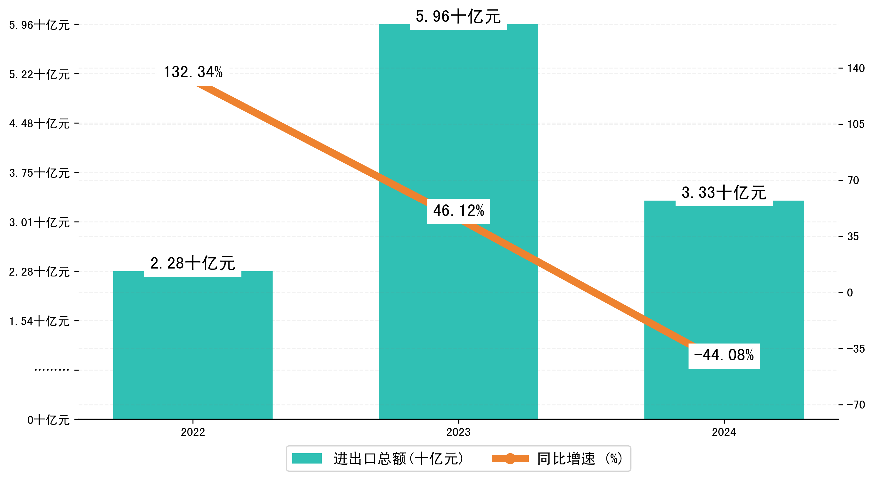 以人民币计,2024年1-1月新余市进出口总额为33,3023.7632万元,相比上年同期减少了26,2515.191万元,同比减少了-44.40%。