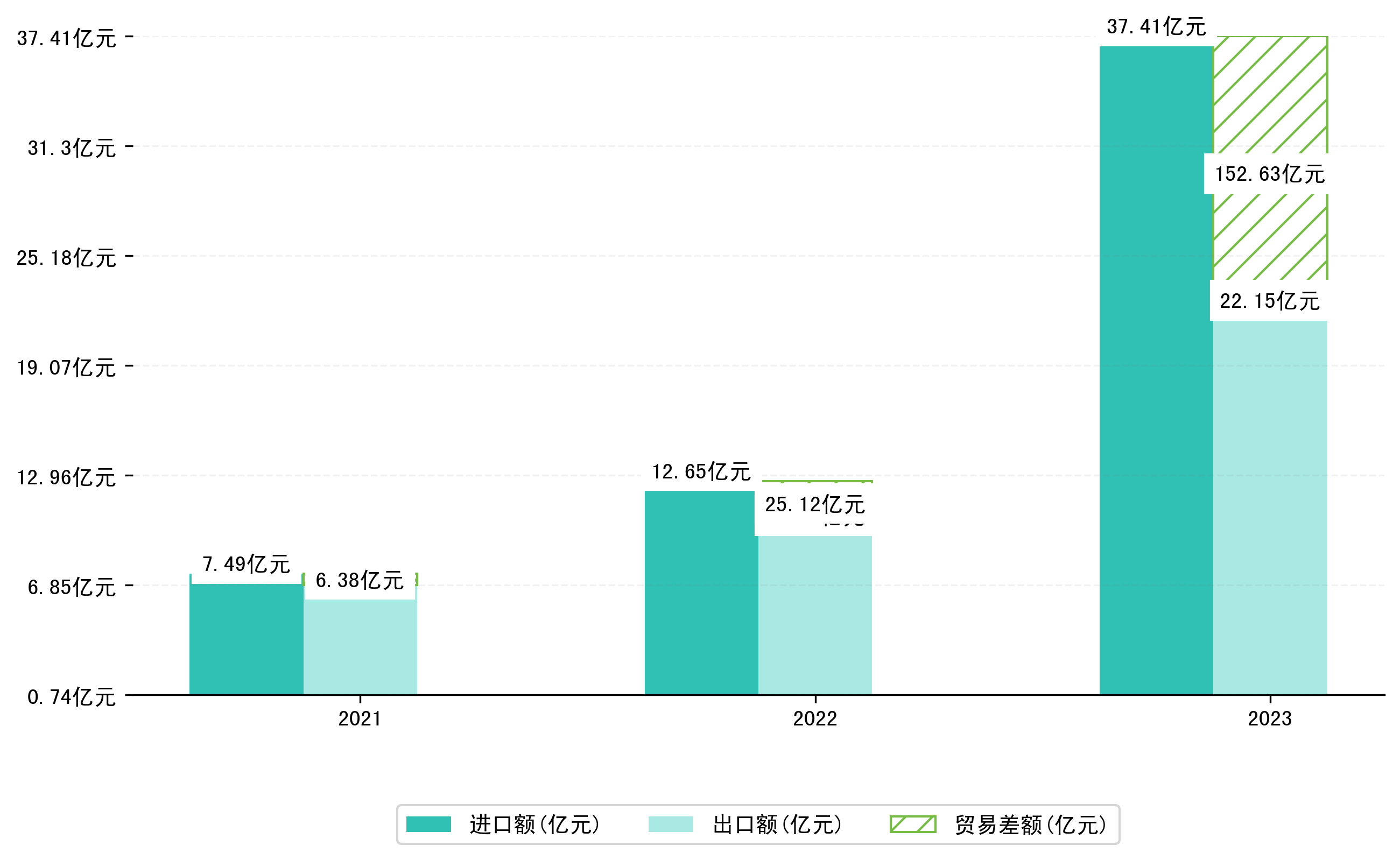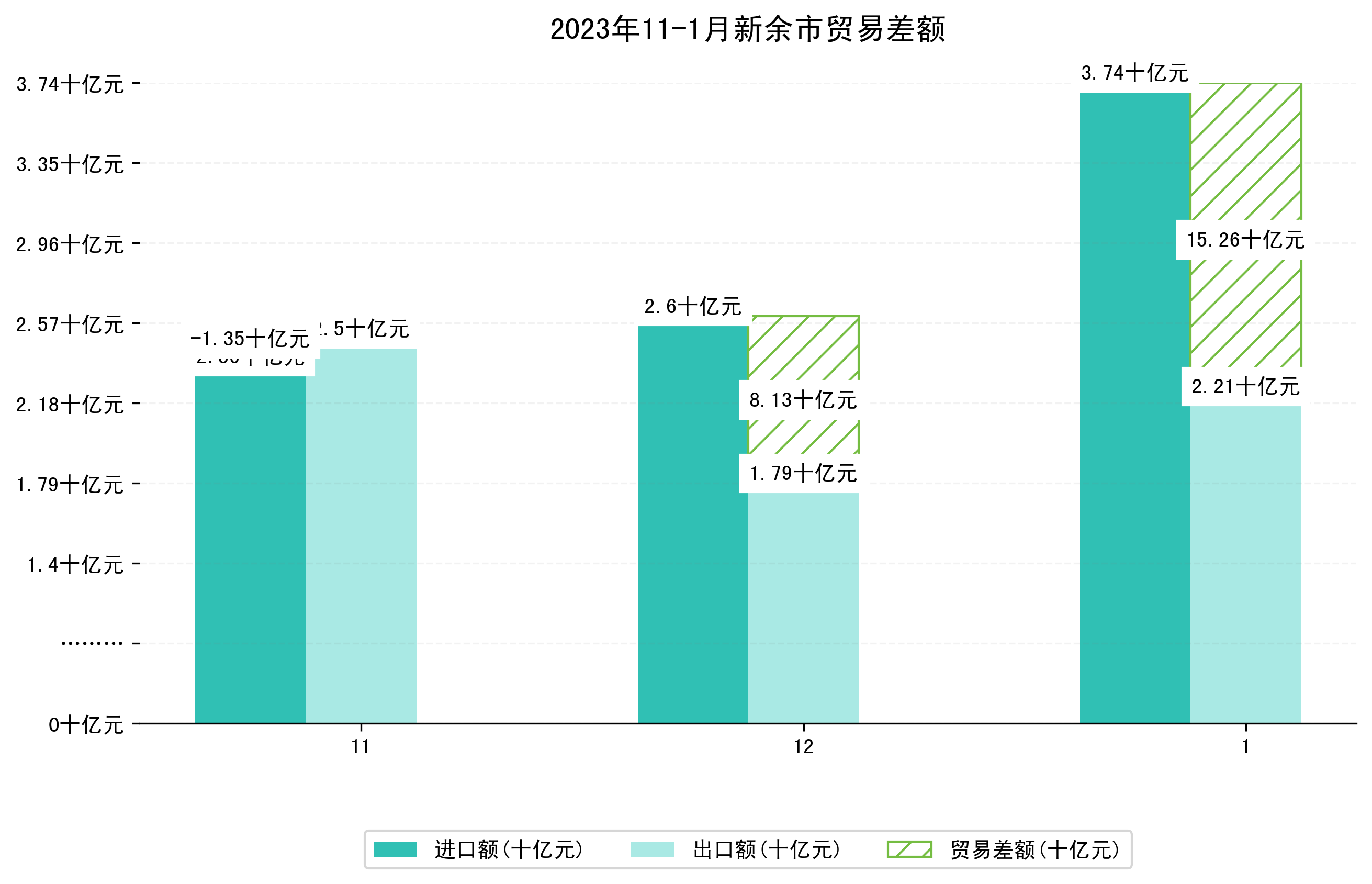 以人民币计,2023年1-1月新余市贸易差额为15,2634,0882万元(贸易逆差),相比上年同期减少了12,7517,4879万元,同比减少507.7%。