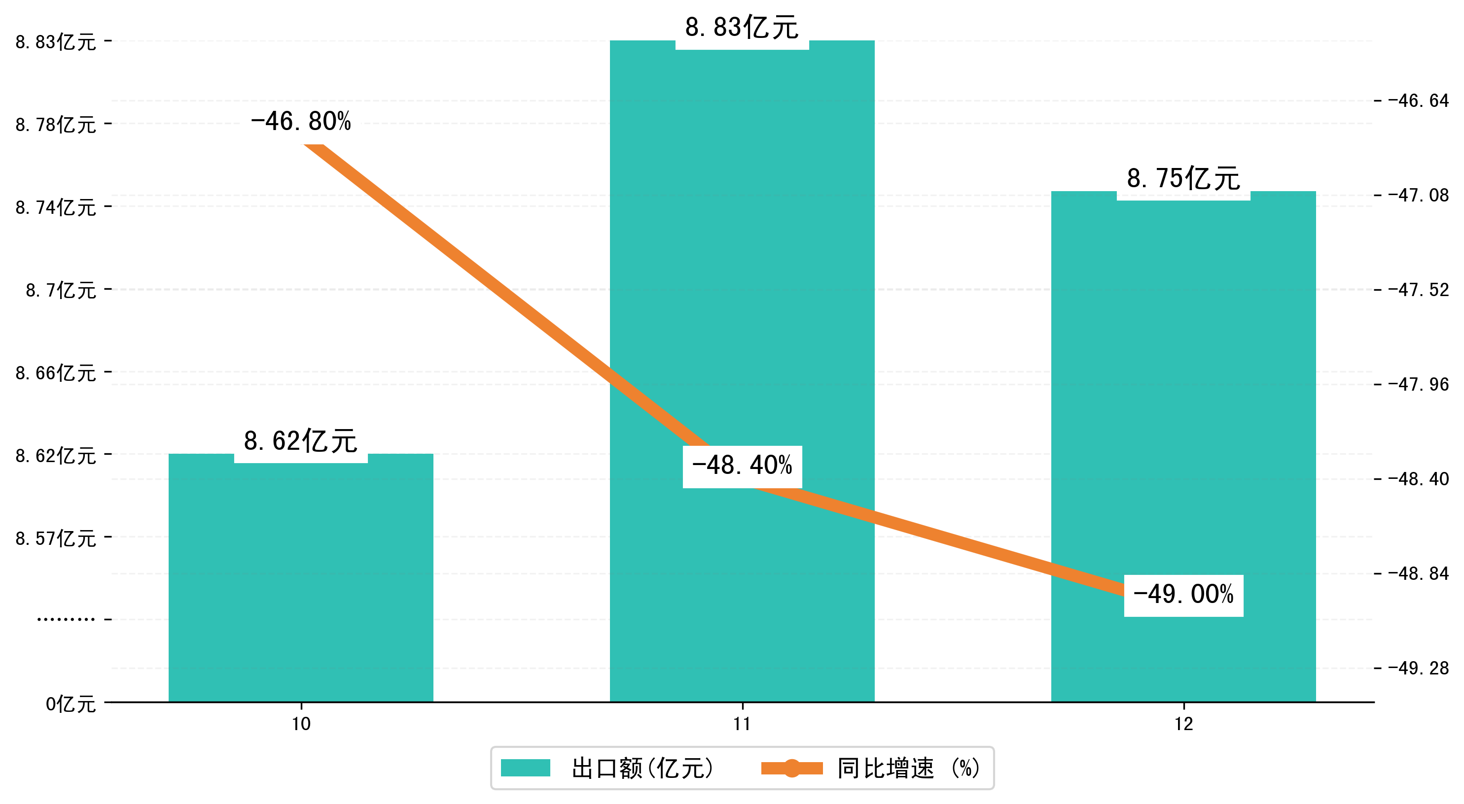 以人民币计,2024年1-12月新余市出口额为131,7932.8621万元,相比上年同期减少了126,5155.8161万元,同比减少了-49.00%。