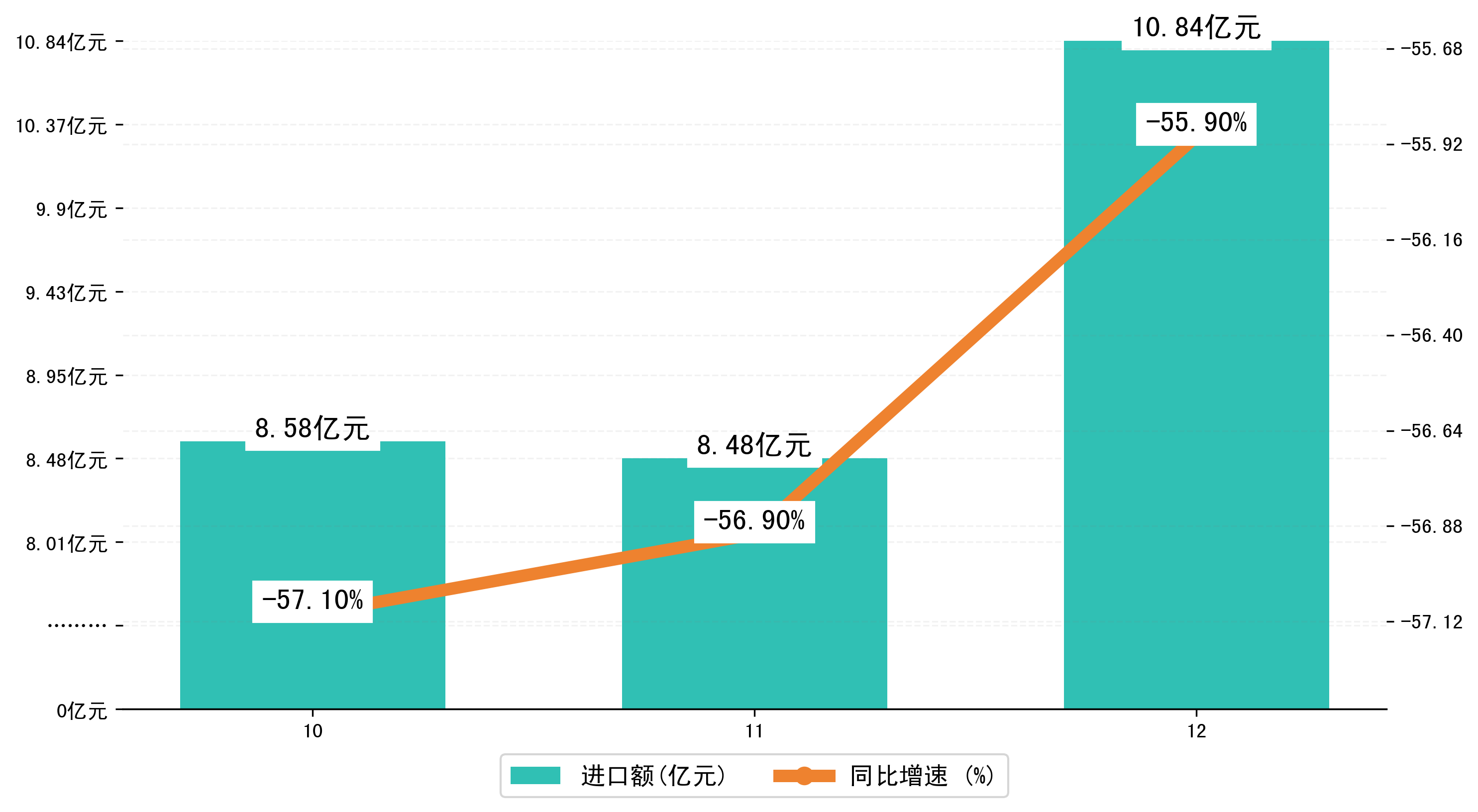 以人民币计,2024年12月新余市进口额为10,8424.1791万元,相比上月增加了2,3620.5765万元;相比上年同期减少了6,0813.8846万元,同比减少了-55.90%。