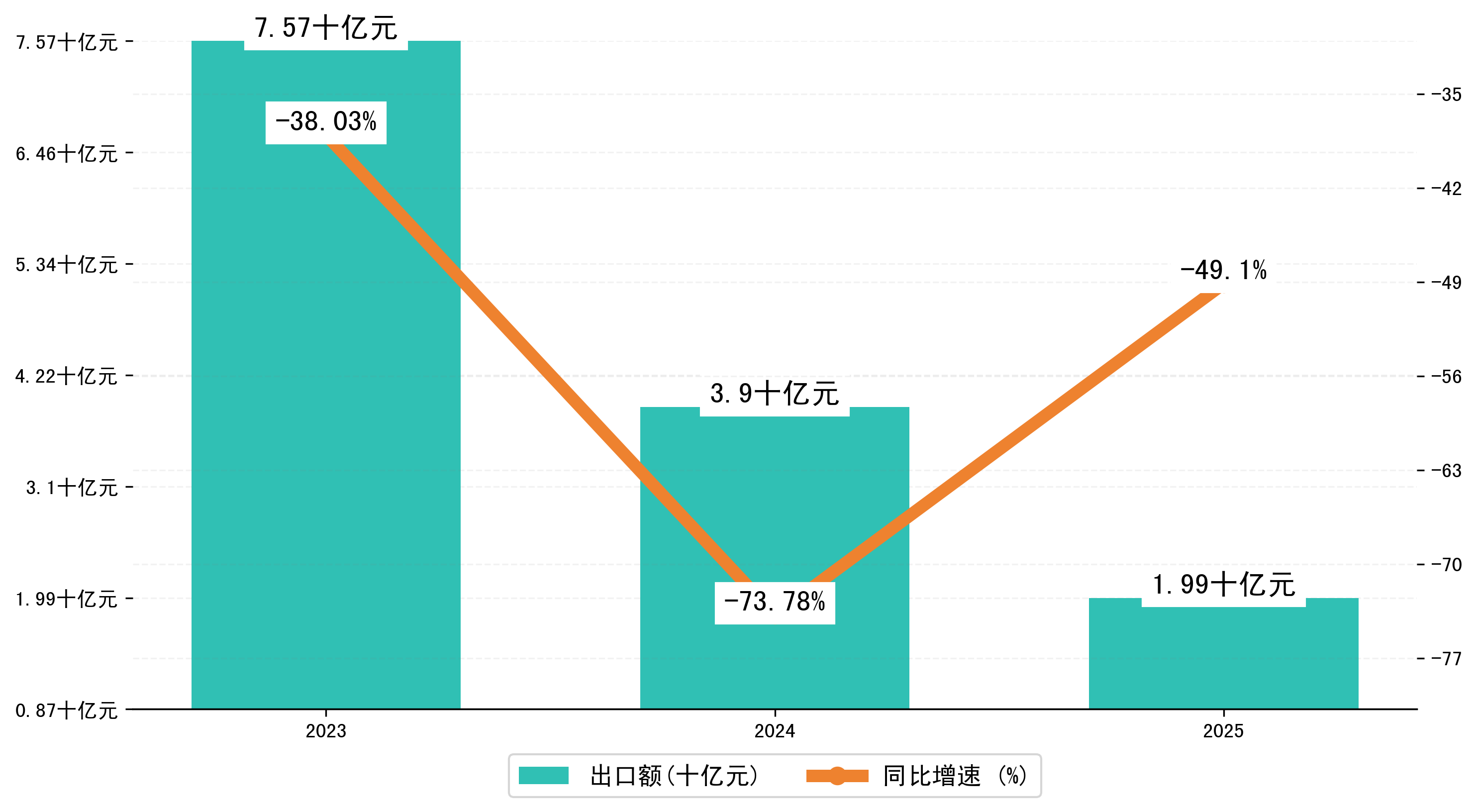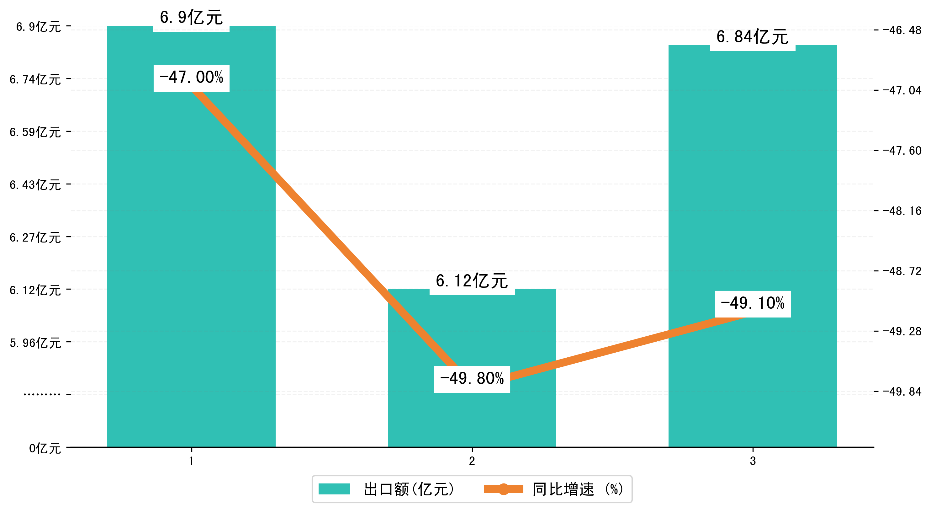 以美元计,2025年1-3月新余市出口额为2,7651.3842万美元,相比上年同期减少了2,7273.5116万美元,同比减少-49.70%。