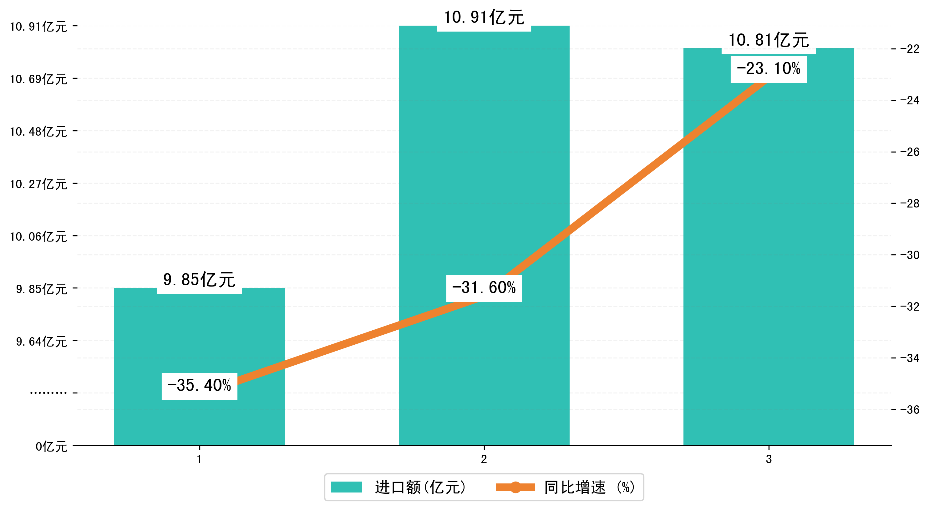 以美元计,2025年1-3月新余市进口额为4,3945.1822万美元,相比上年同期减少了1,7057.1089万美元,同比减少-23.80%。