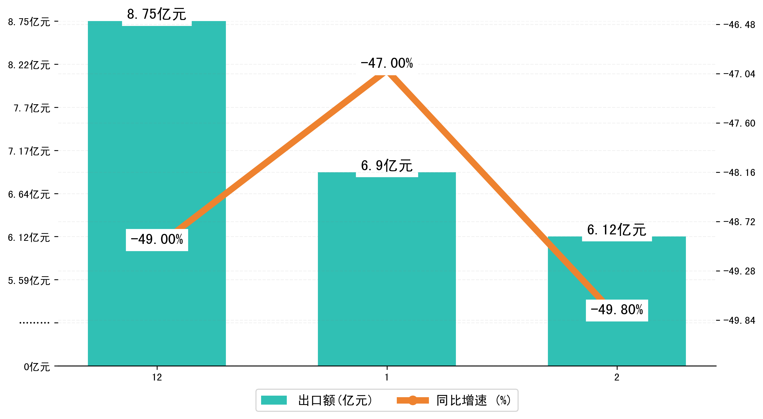 以美元计,2025年1-2月新余市出口额为1,8108.1736万美元,相比上年同期减少了1,8404.26万美元,同比减少-50.40%。