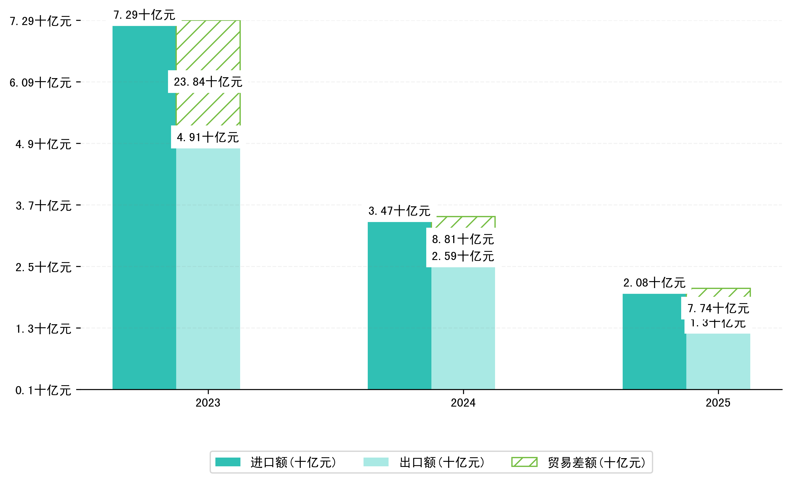 以人民币计,2025年1-2月新余市贸易差额为7,7371,7972万元(贸易逆差),相比上年同期增加了1,0710,1690万元,同比增加-12.16%。