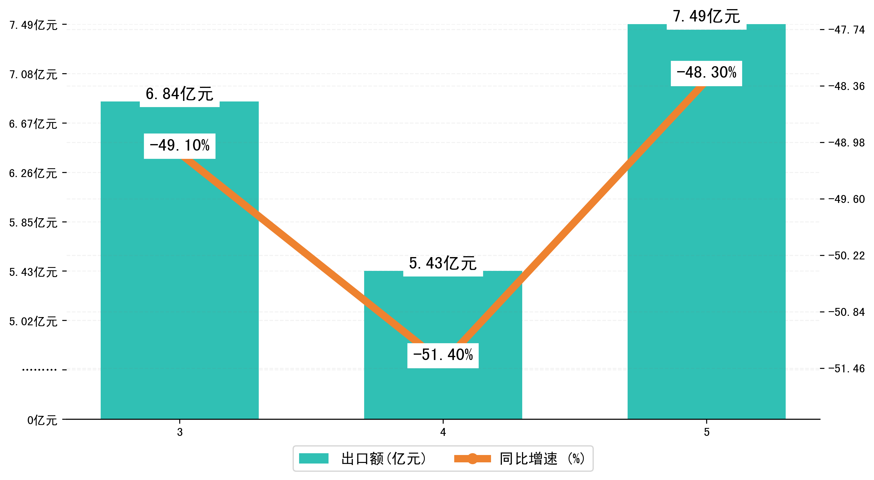 以人民币计,2025年5月新余市出口额为7,4870.5264万元,相比上月增加了2,0523.4118万元;相比上年同期减少了3,8933.9797万元,同比减少了-48.30%。
