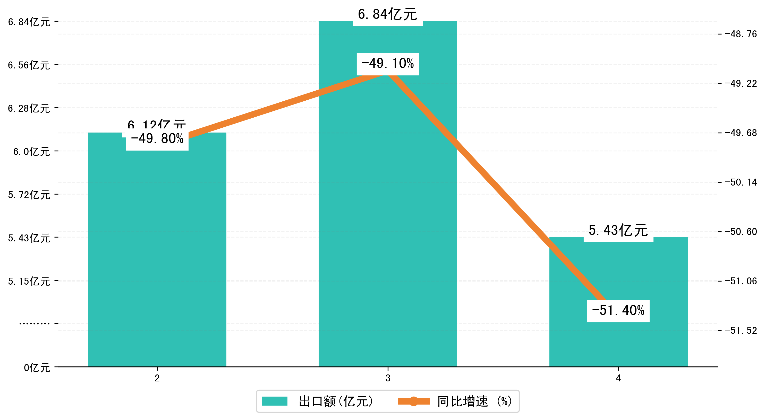 以美元计,2025年1-4月新余市出口额为3,5229.3572万美元,相比上年同期减少了3,8033.6755万美元,同比减少-51.90%。