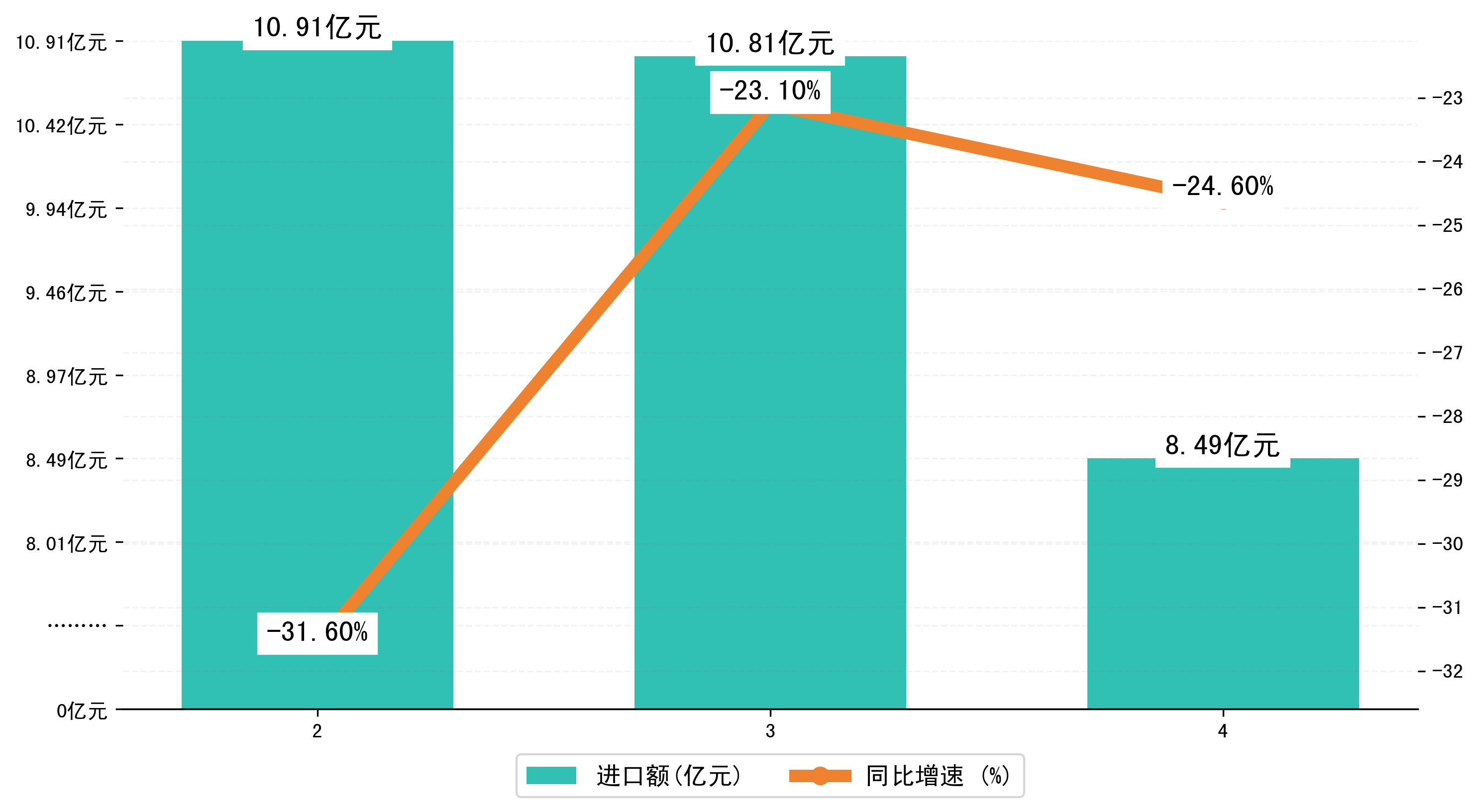 以人民币计,2025年1-4月新余市进口额为40,0742.1975万元,相比上年同期减少了15,2318.7819万元,同比减少了-24.60%。