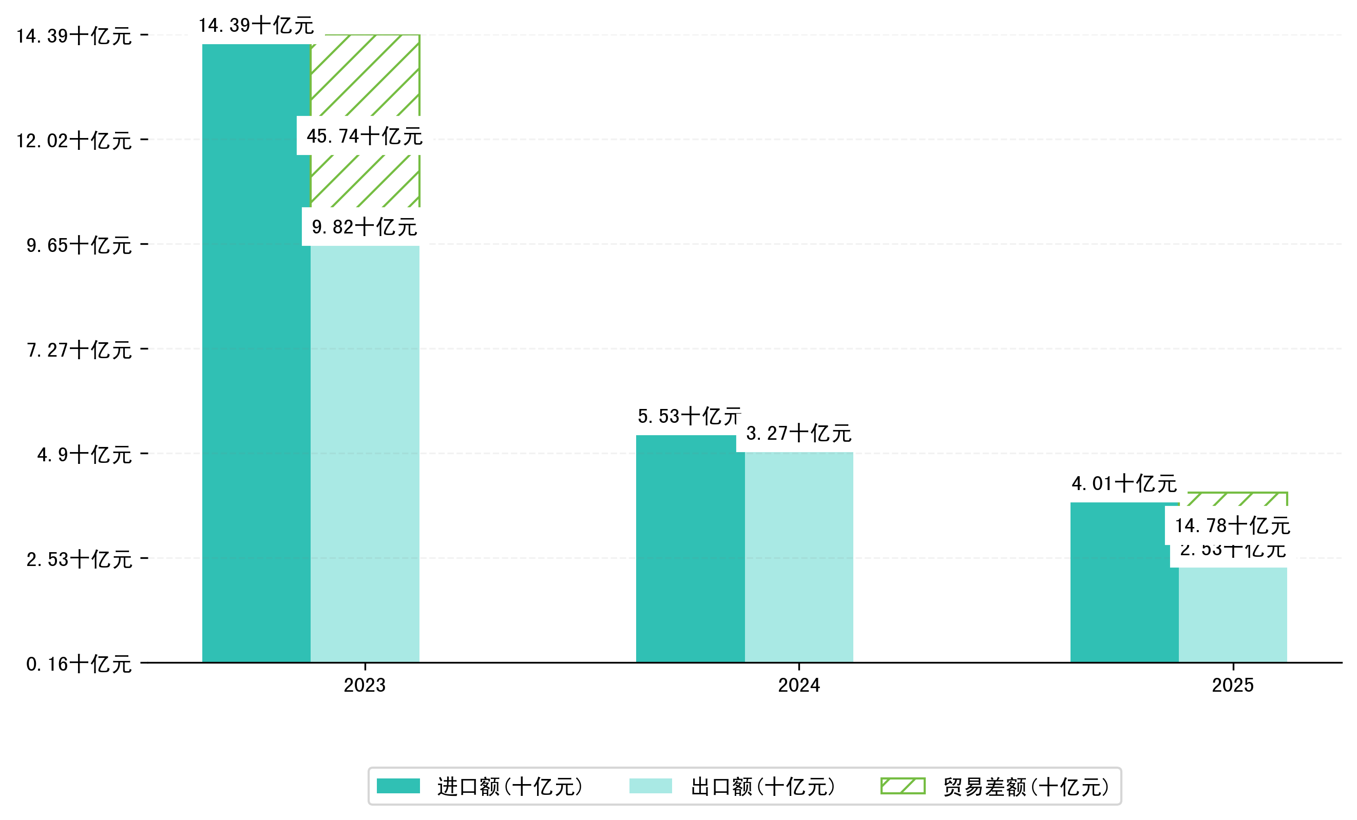 以美元计,2025年1-4月新余市贸易差额为2,0576,8923万美元(贸易逆差),相比上年同期减少了1,6082,5609万美元,同比减少357.84%。