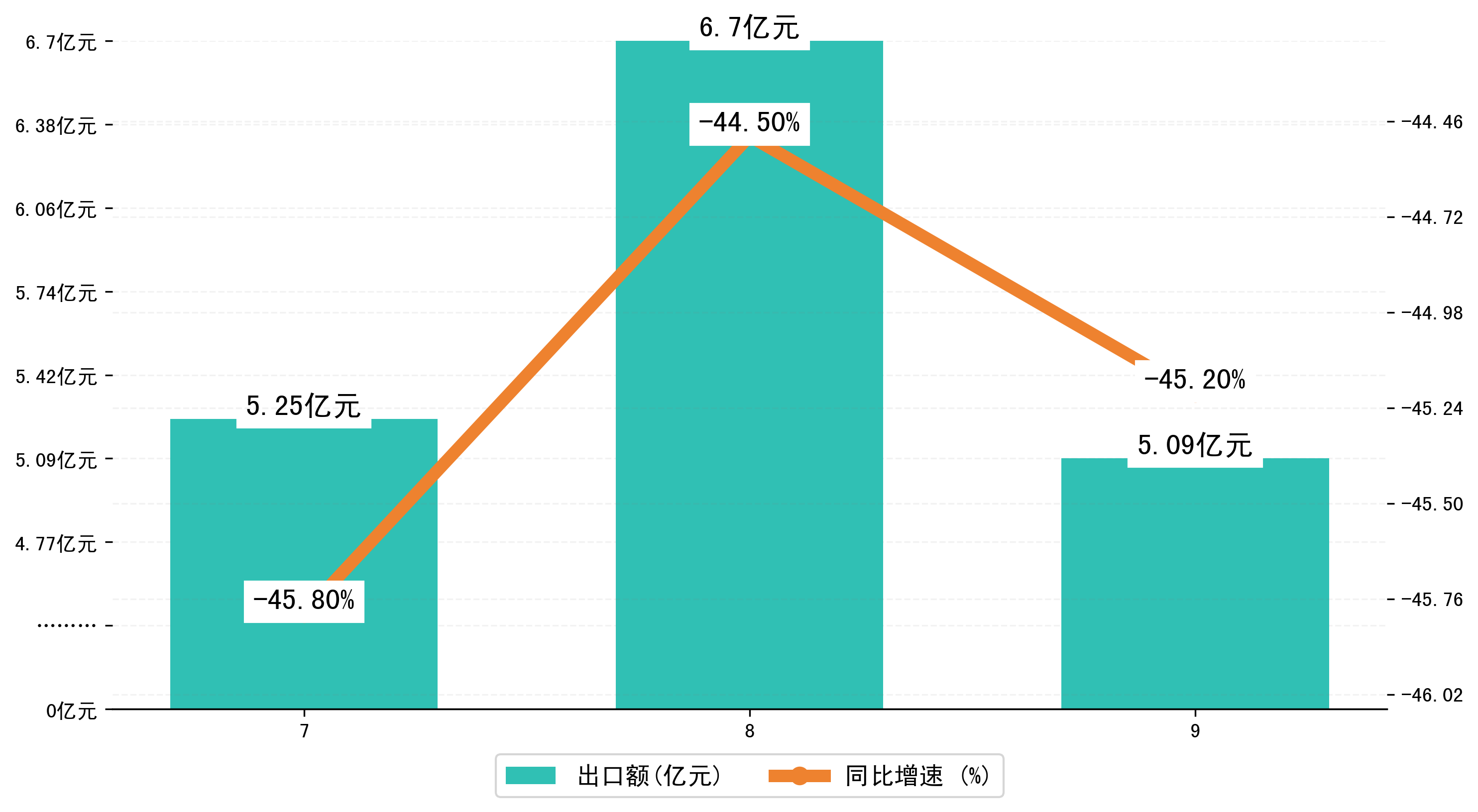 以美元计,2025年9月新余市出口额为7146.3861万美元,相比上月减少了2208.9027万美元;相比上年同期减少了7596.0579万美元,同比减少-45.70%。