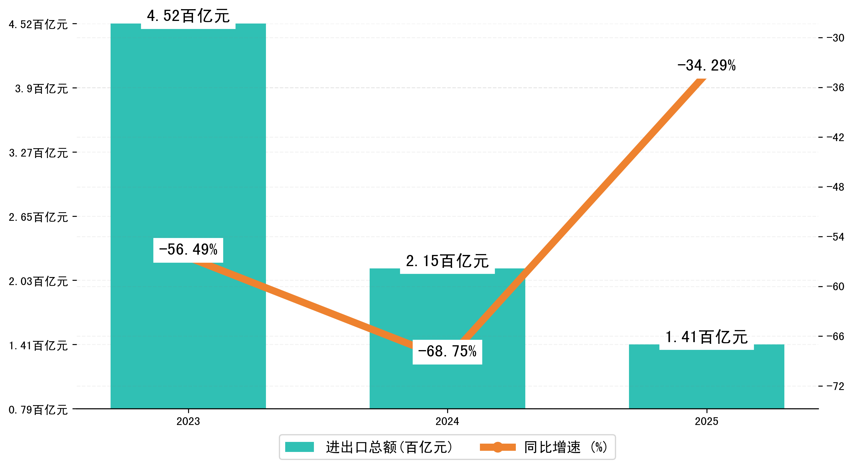 以人民币计,2025年1-9月新余市进出口总额为141,1494.8751万元,相比上年同期减少了73,6587.4802万元,同比减少了-33.20%。
