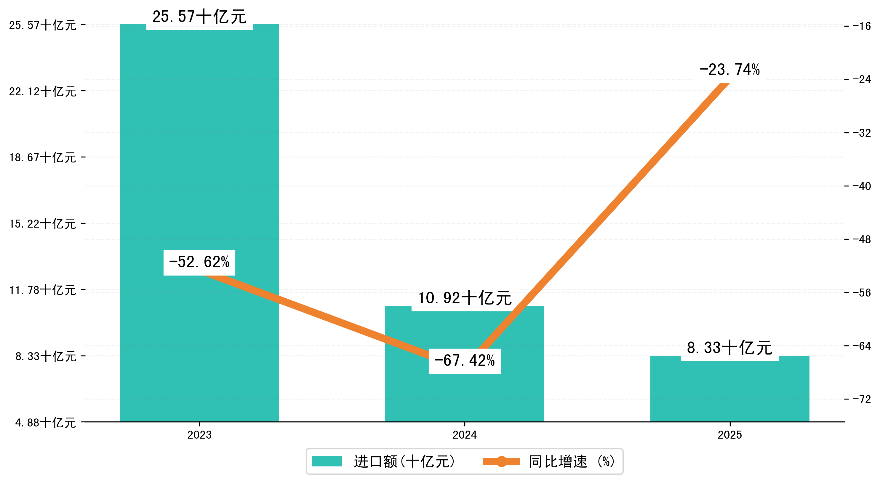 以美元计,2025年1-9月新余市进口额为11,6043.5098万美元,相比上年同期减少了3,7531.5747万美元,同比减少-21.90%。