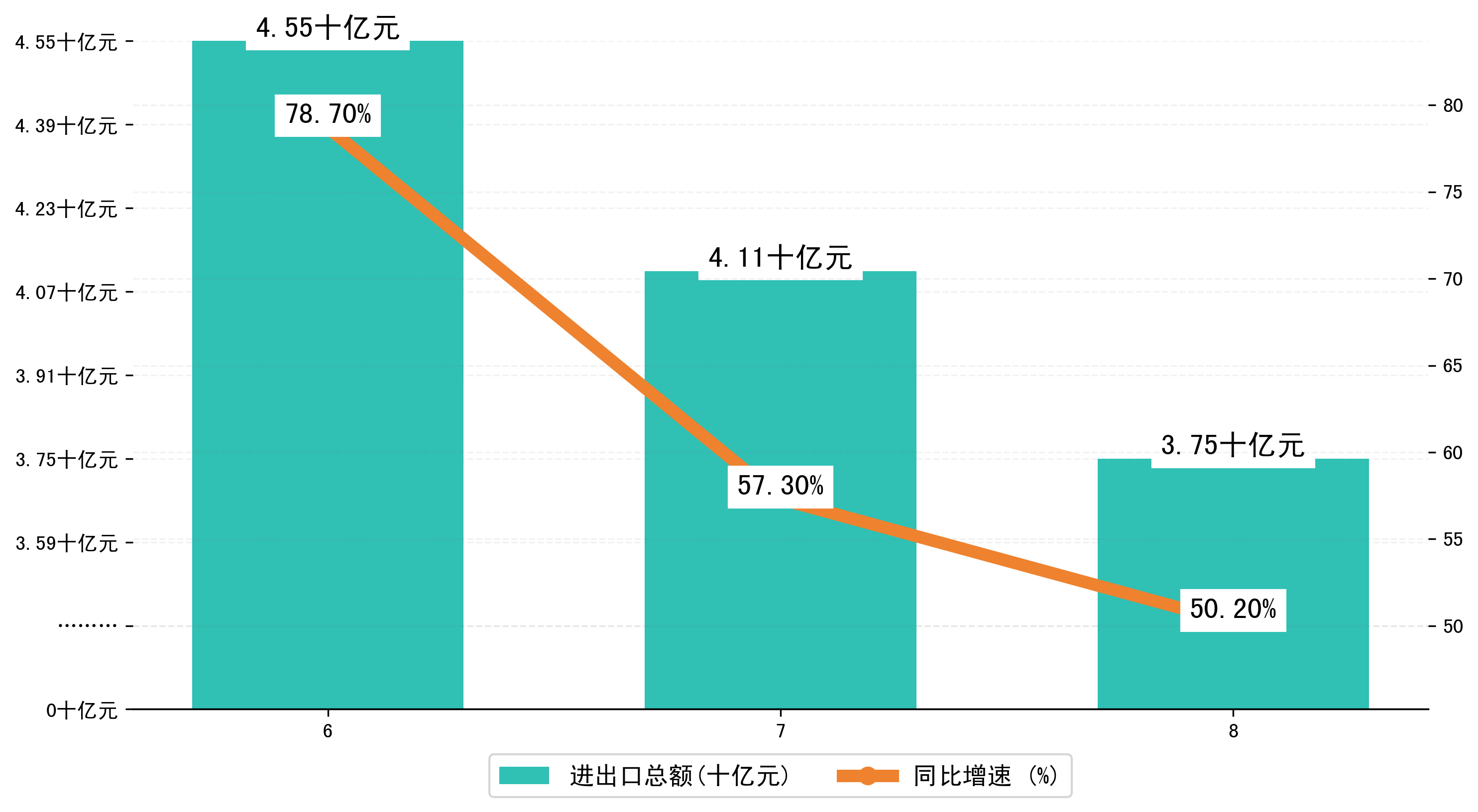 以人民币计,2023年1-8月新余市进出口总额为413,0089.4372万元,相比上年同期增加了139,1620.524万元,同比增加了50.20%。