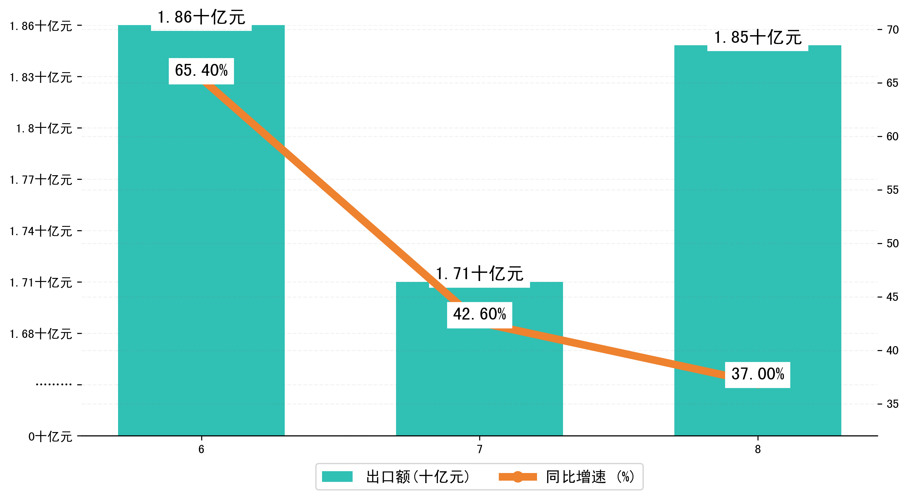 以人民币计,2023年8月新余市出口额为18,5148.9069万元,相比上月增加了1,4295.4211万元;相比上年同期增加了4141.5082万元,同比增加了37.00%。