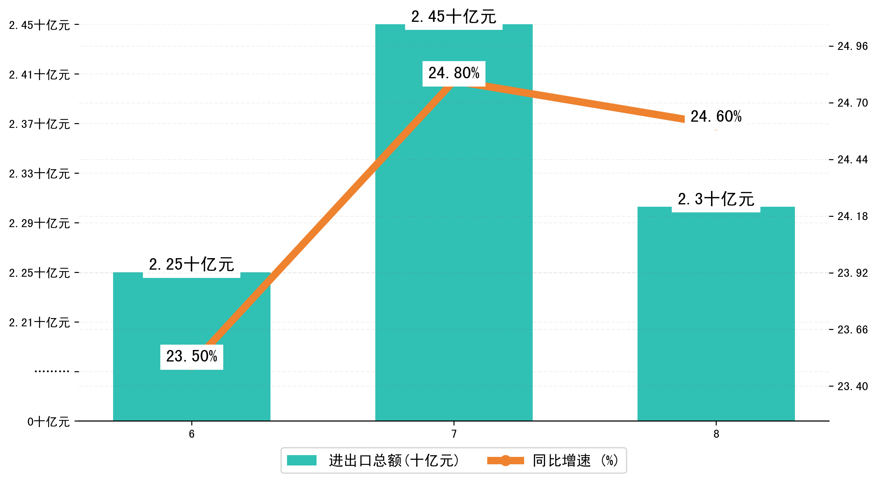 以人民币计,2024年1-8月宣城市进出口总额为170,6414.2683万元,相比上年同期增加了32,8702.2479万元,同比增加了24.60%。