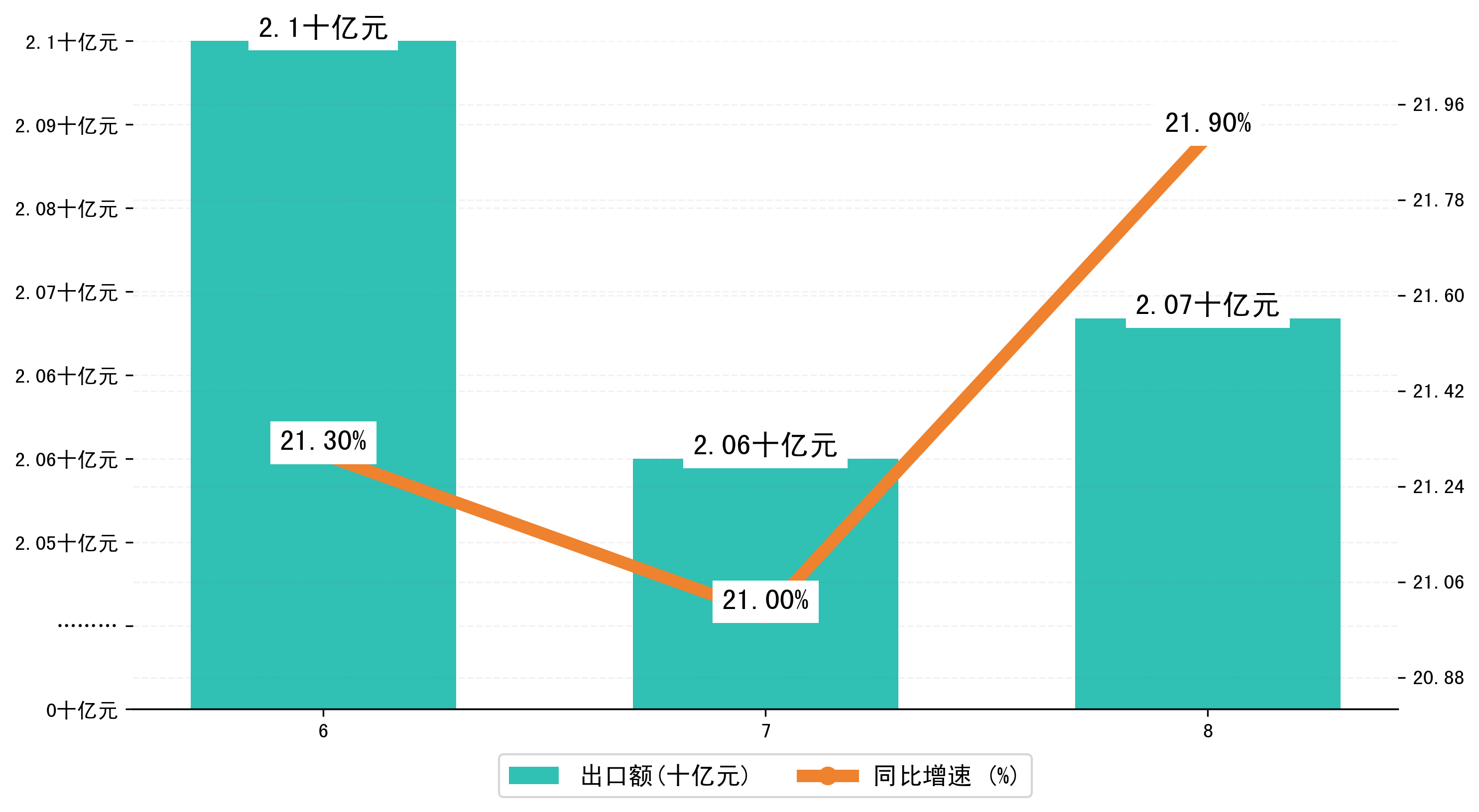 以人民币计,2024年1-8月宣城市出口额为153,4080.1623万元,相比上年同期增加了26,7541.3778万元,同比增加了21.90%。