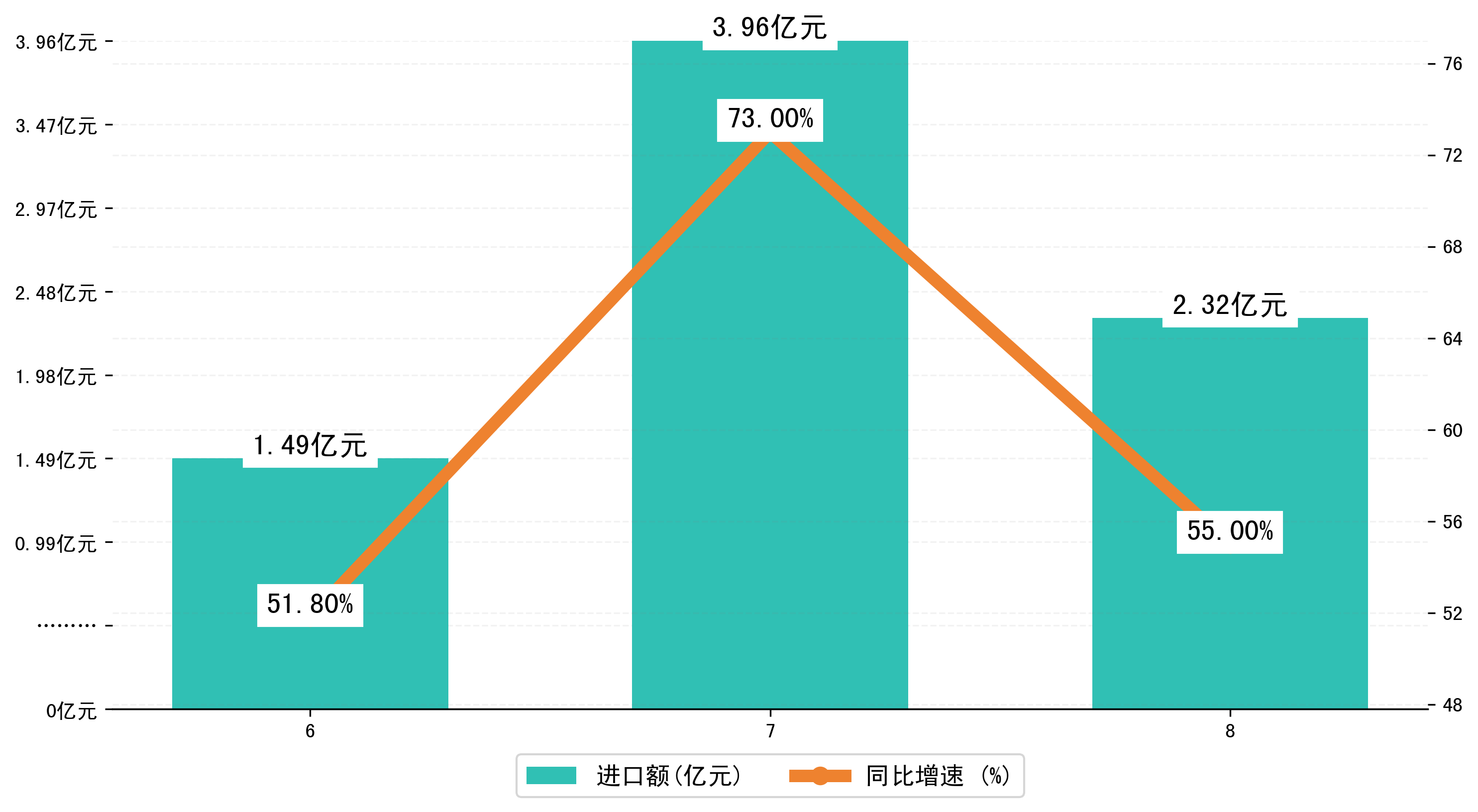 以人民币计,2024年1-8月宣城市进口额为17,2334.106万元,相比上年同期增加了6,1160.8701万元,同比增加了55.00%。