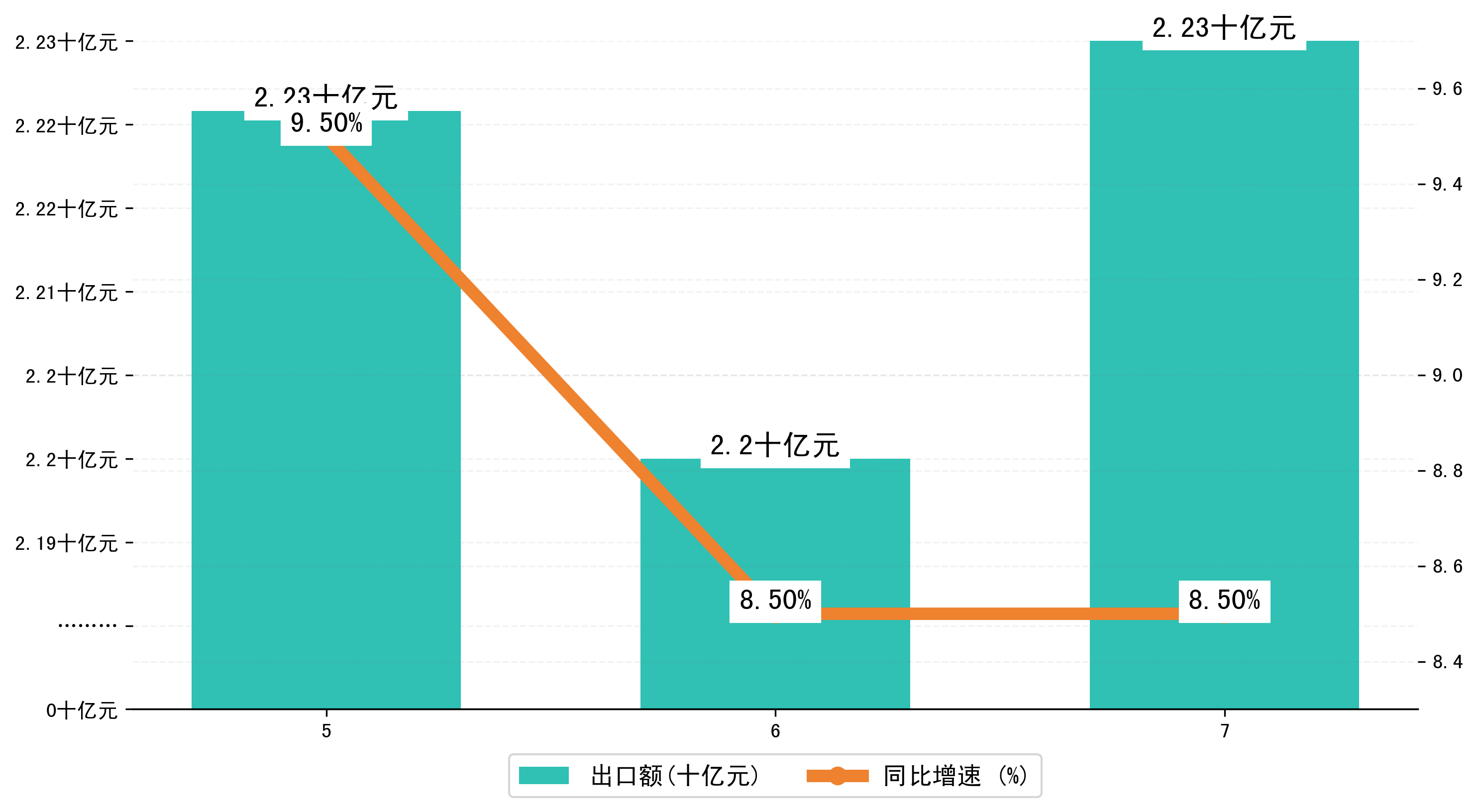 以人民币计,2025年7月宣城市贸易差额为19,9318,9930万元(贸易顺差),相比上月增加了2673,8621万元,即459,0189万美元;相比上年同期增加了3,3422,4273万元,同比增加20.15%。