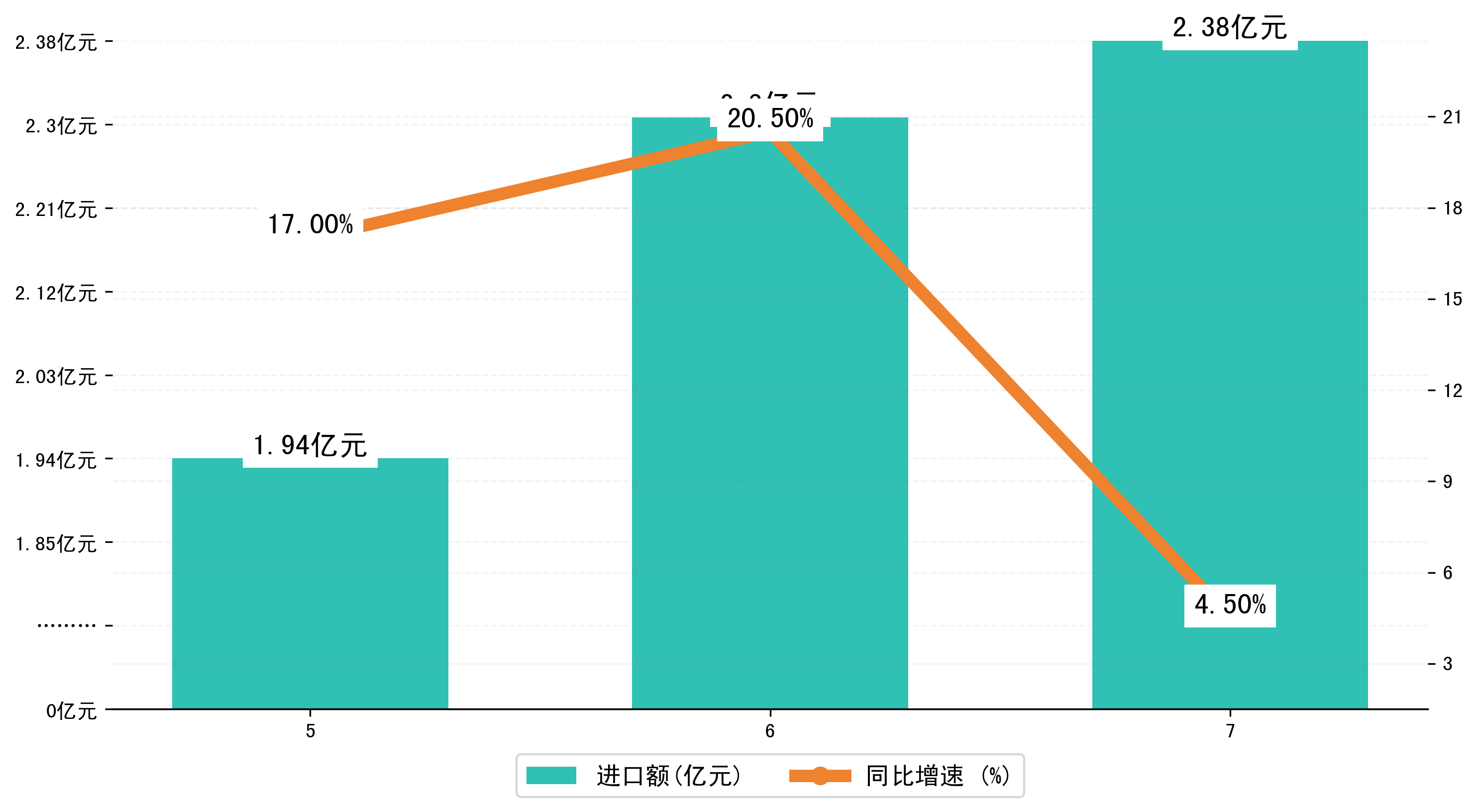 以美元计,2025年1-7月宣城市进口额为2,1694.0211万美元,相比上年同期增加了709.5431万美元,同比增加3.40%。