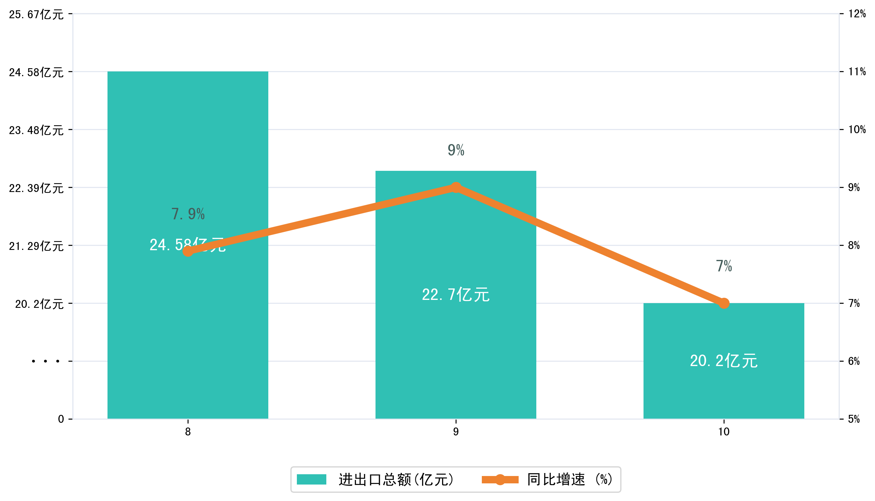 以人民币计,2025年1-10月宣城市进出口总额为226,8077.1208万元,相比上年同期增加了14,8601.8318万元,同比增加了7.00%。