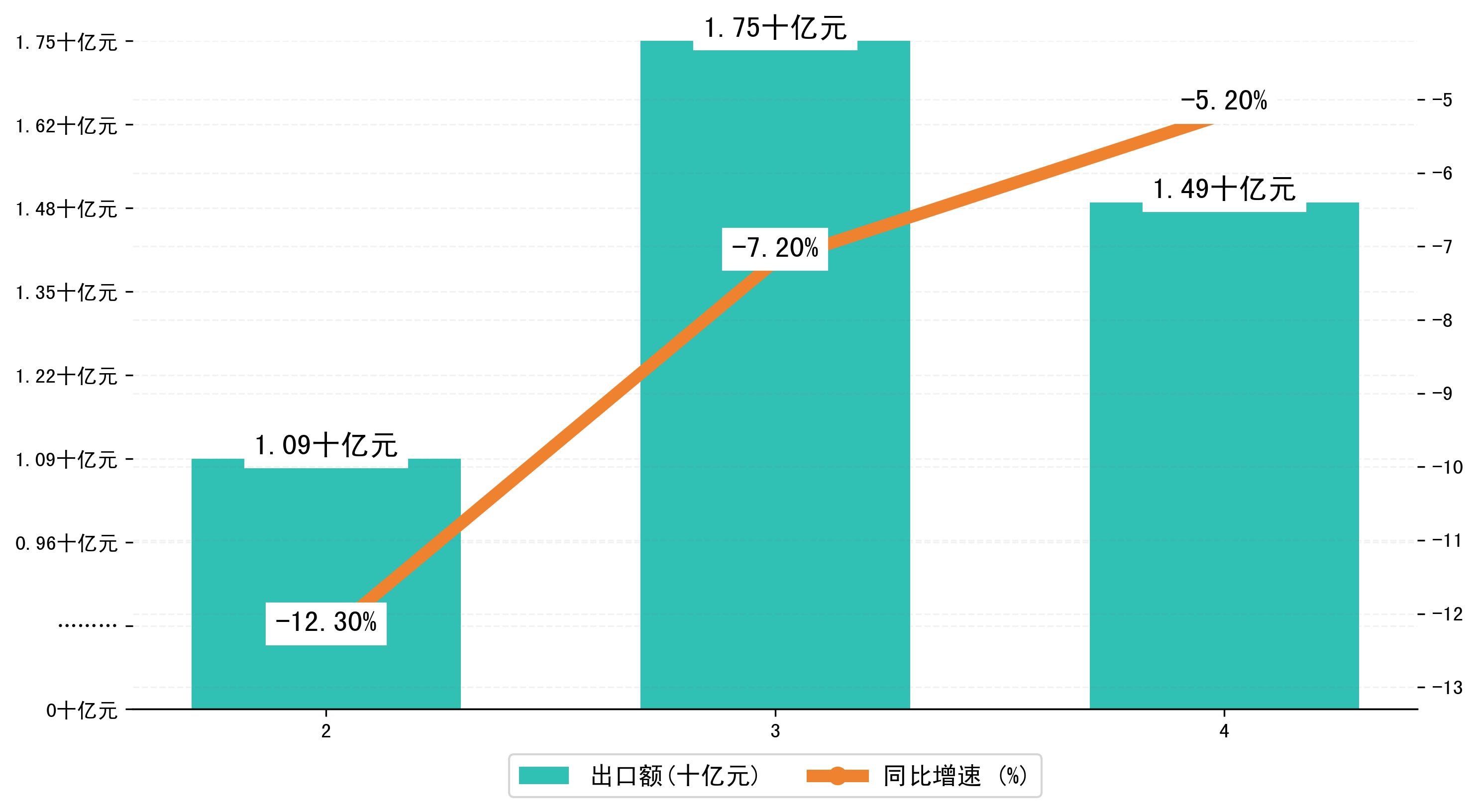 以人民币计,2023年1-4月宣城市出口额为59,5639.7659万元,相比上年同期减少了3,2714.1584万元,同比减少了-5.20%。