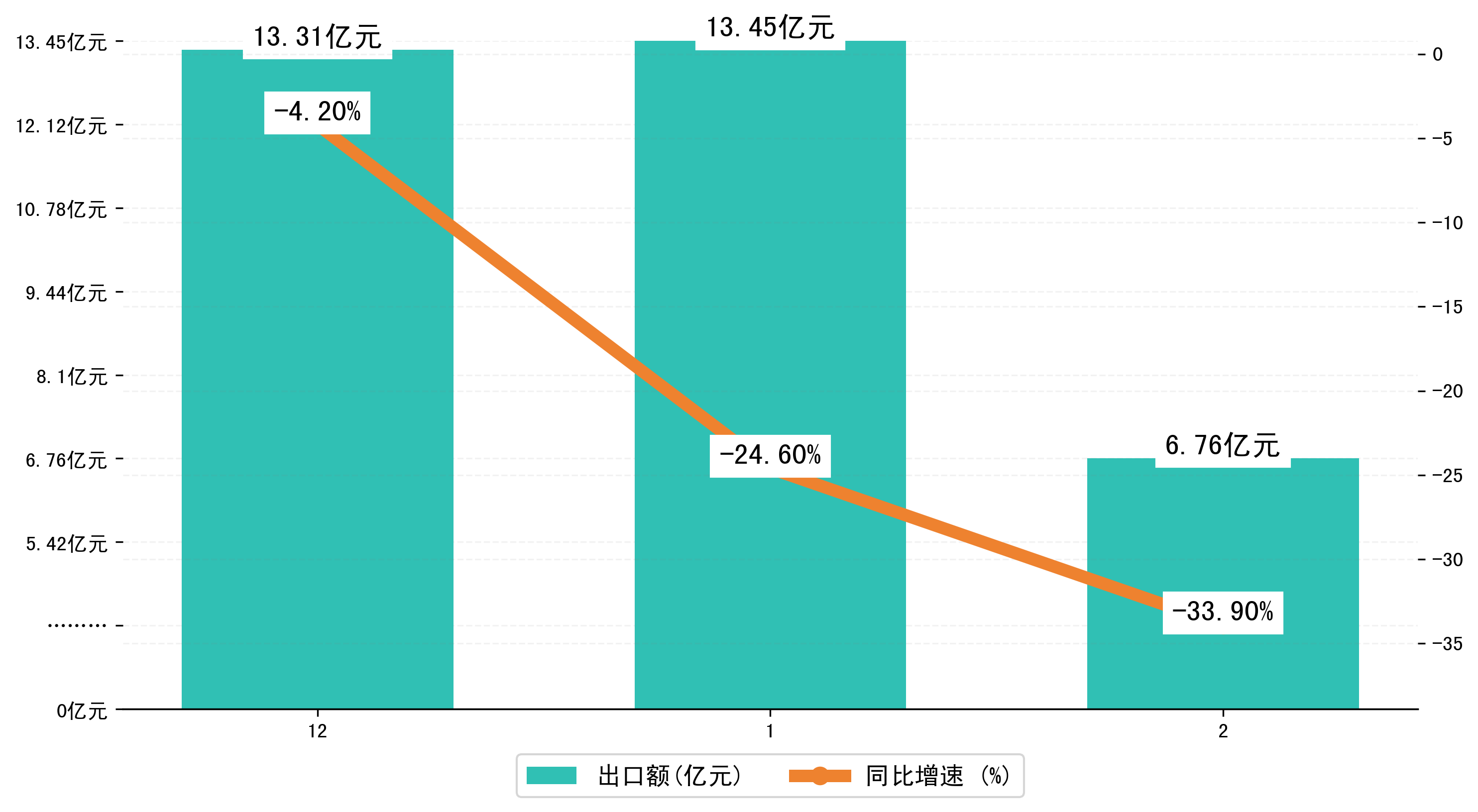 以人民币计,2023年2月阳江市出口额为6,7604.8674万元,相比上月减少了6,6936.1965万元;相比上年同期减少了5,9562.7532万元,同比减少了-33.90%。