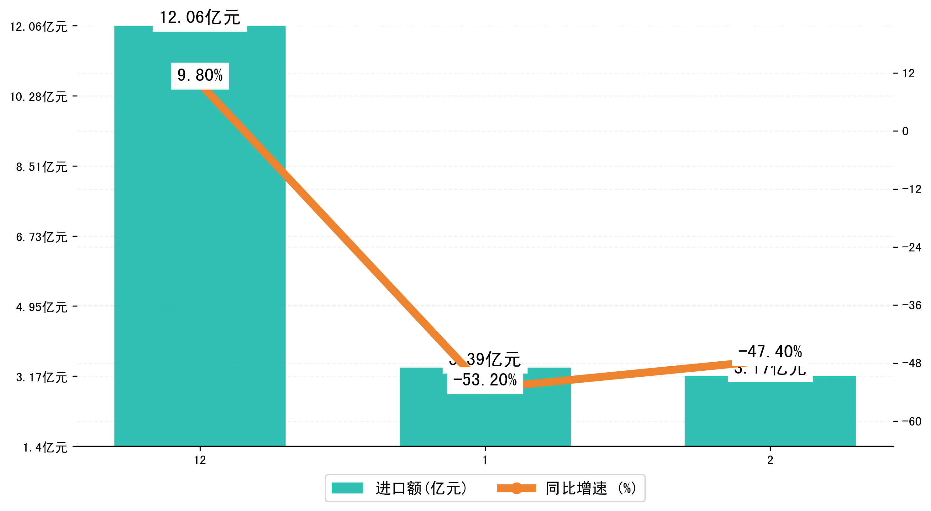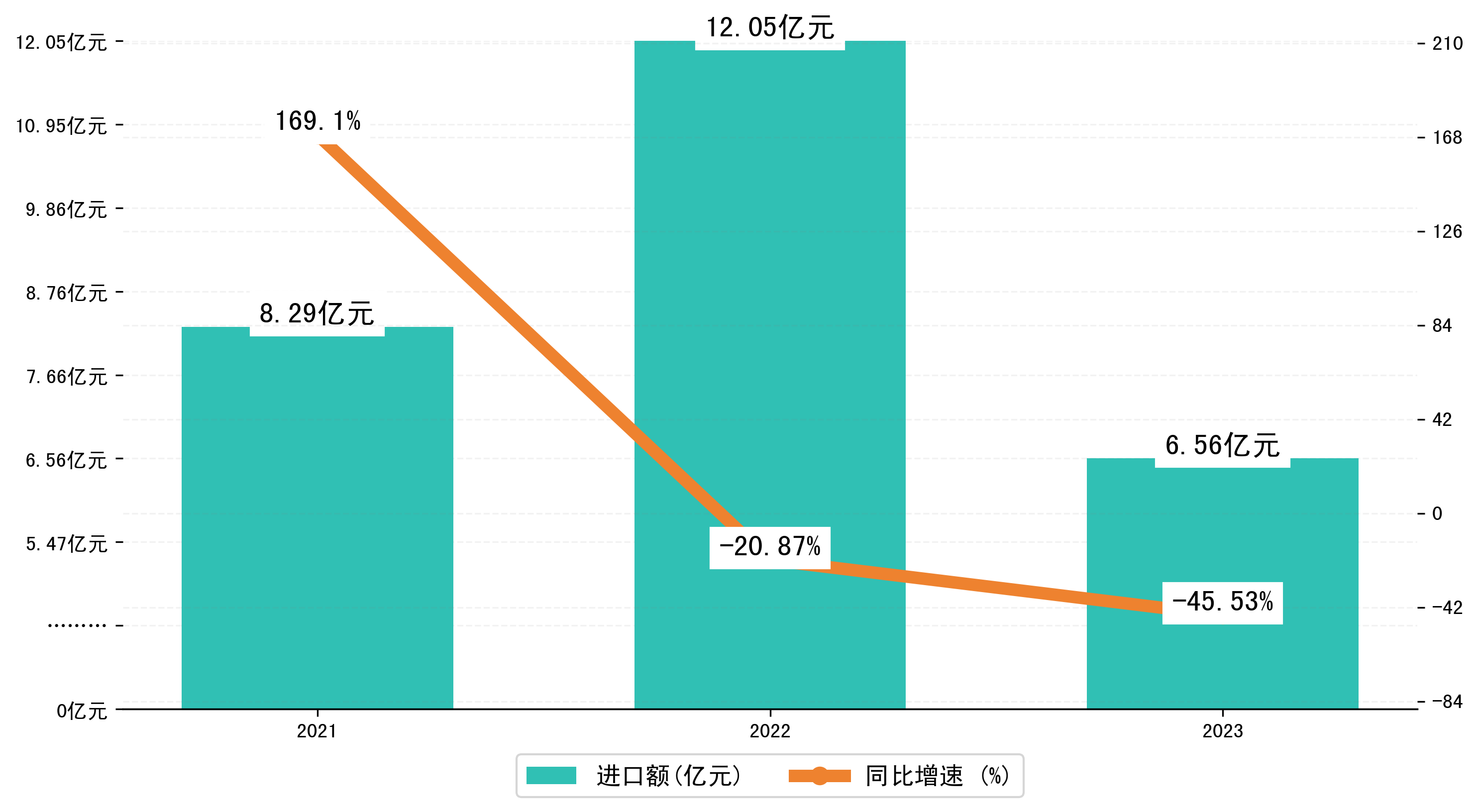 以人民币计,2023年1-2月阳江市进口额为6,5629.1526万元,相比上年同期减少了5,4868.5711万元,同比减少了-47.40%。