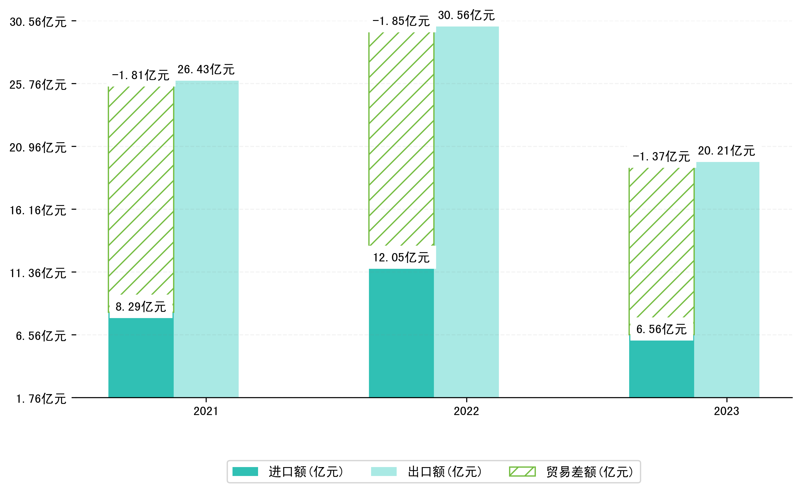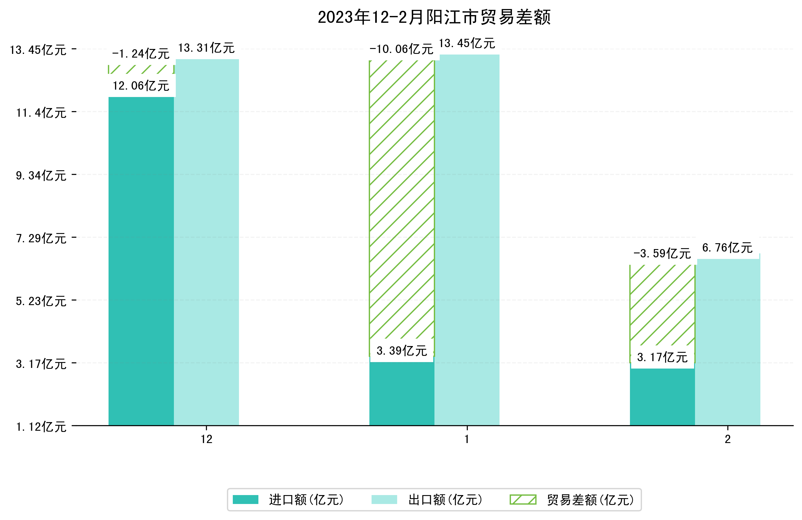 以人民币计,2023年1-2月阳江市贸易差额为13,6516,7788万元(贸易顺差),相比上年同期减少了4,8607,4284万元,同比减少-26.26%。