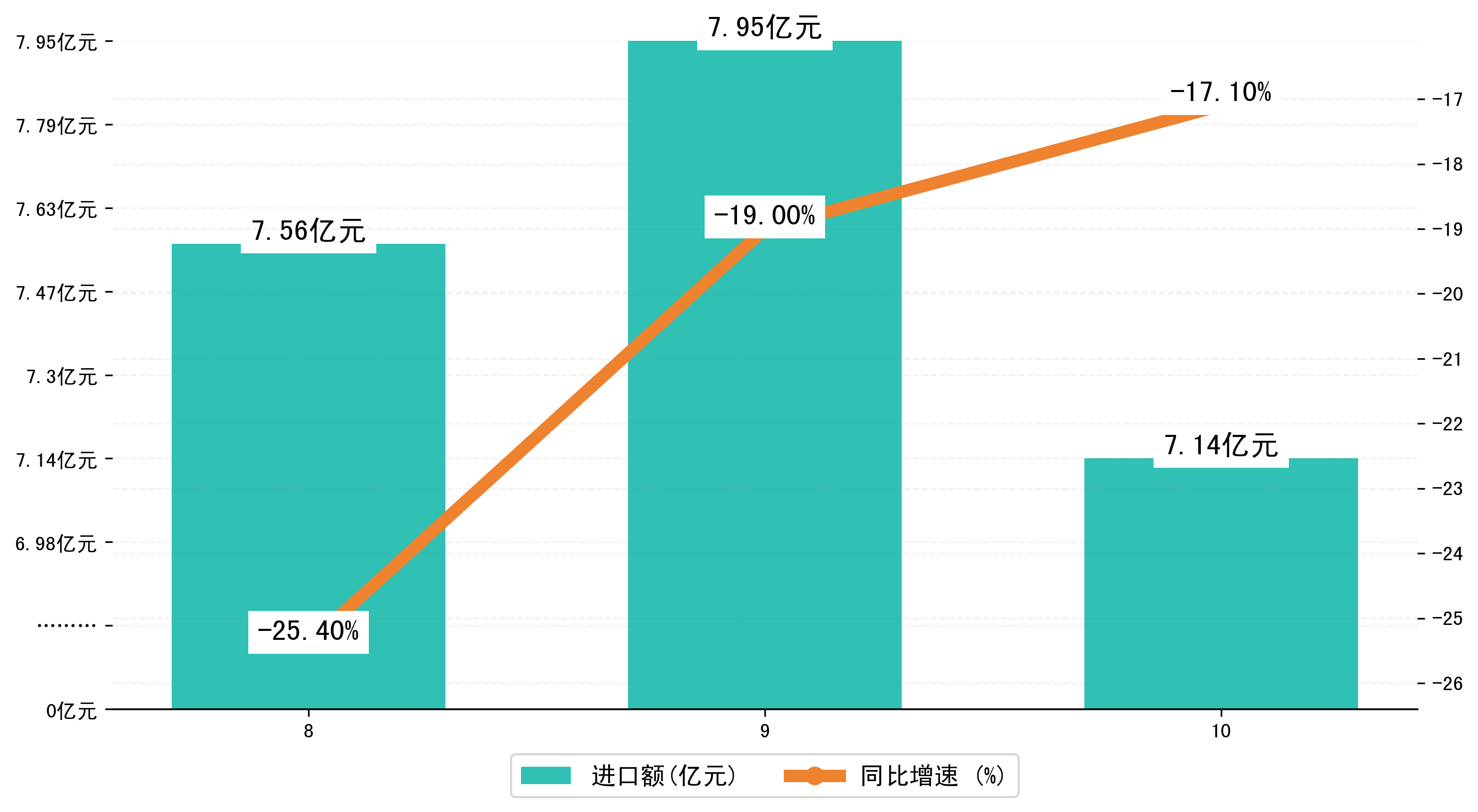 以人民币计,2023年10月阳江市进口额为7,1425.0285万元,相比上月减少了8106.8196万元;相比上年同期增加了155.0462万元,同比减少了-17.10%。