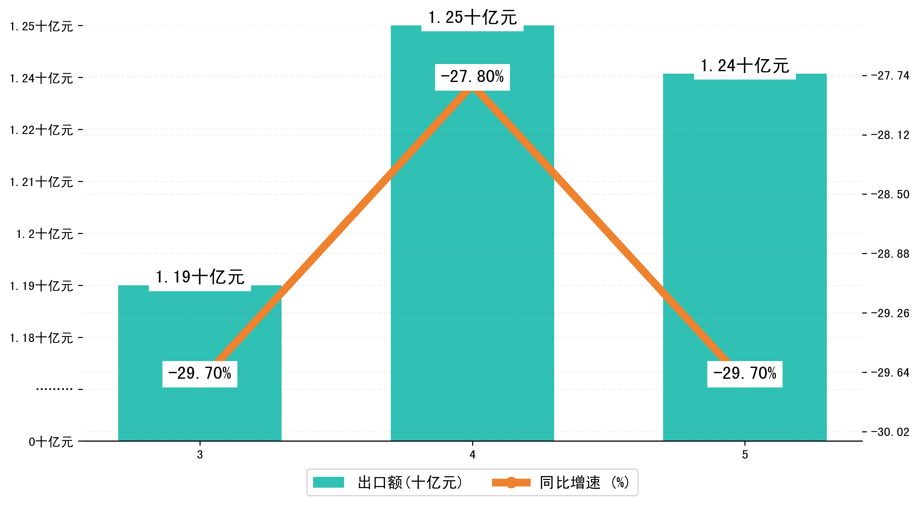 以人民币计,2023年5月阳江市出口额为12,3598.4051万元,相比上月减少了1109.2994万元;相比上年同期减少了6,9023.8976万元,同比减少了-29.70%。
