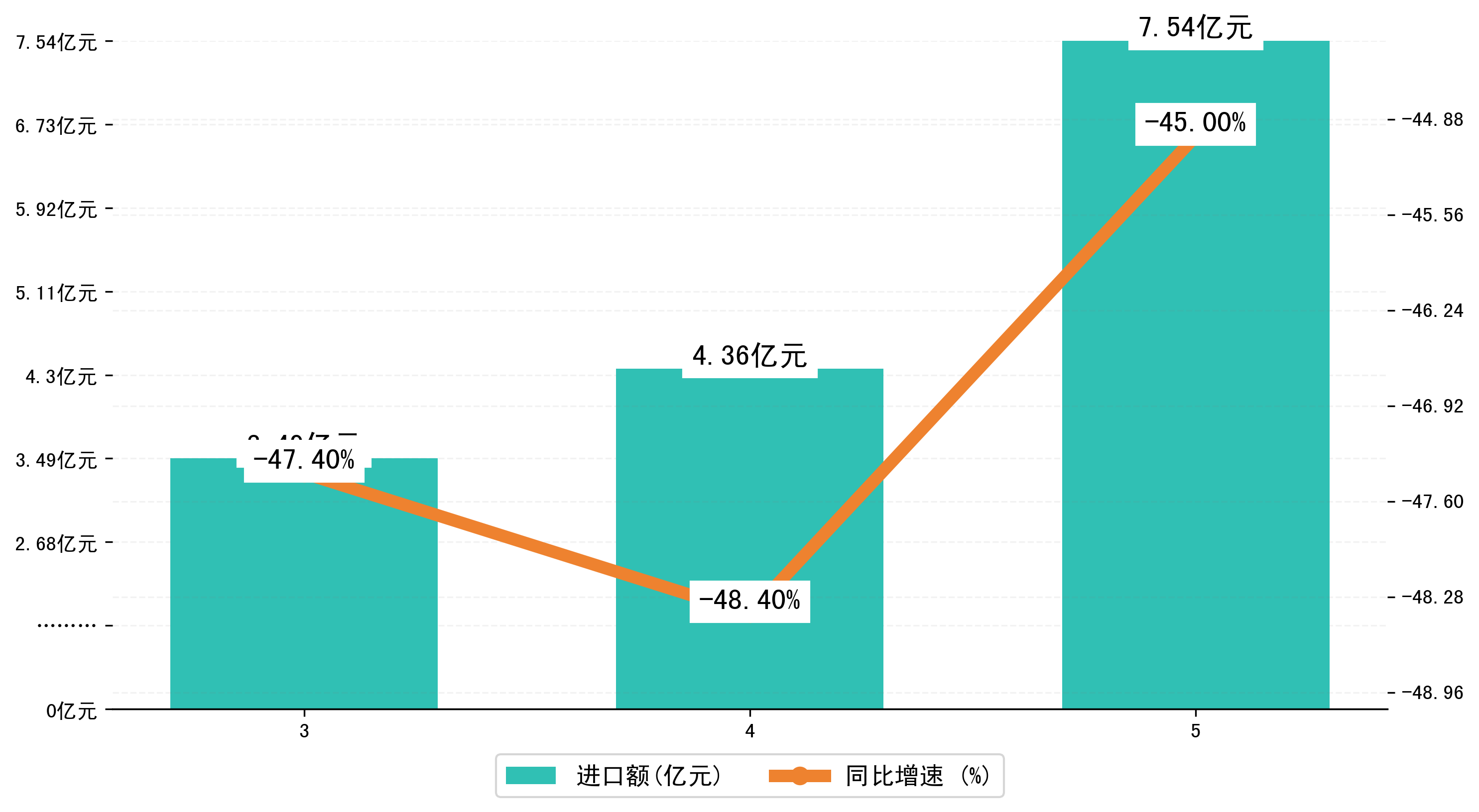 以美元计,2023年1-5月阳江市进口额为3,2401.8468万美元,相比上年同期减少了3,0610.202万美元,同比减少-48.90%。