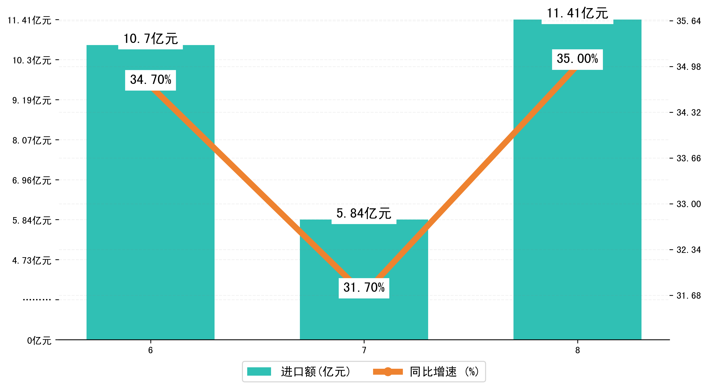 以人民币计,2024年1-8月阳江市进口额为60,6373.5549万元,相比上年同期增加了15,6641.7283万元,同比增加了35.00%。
