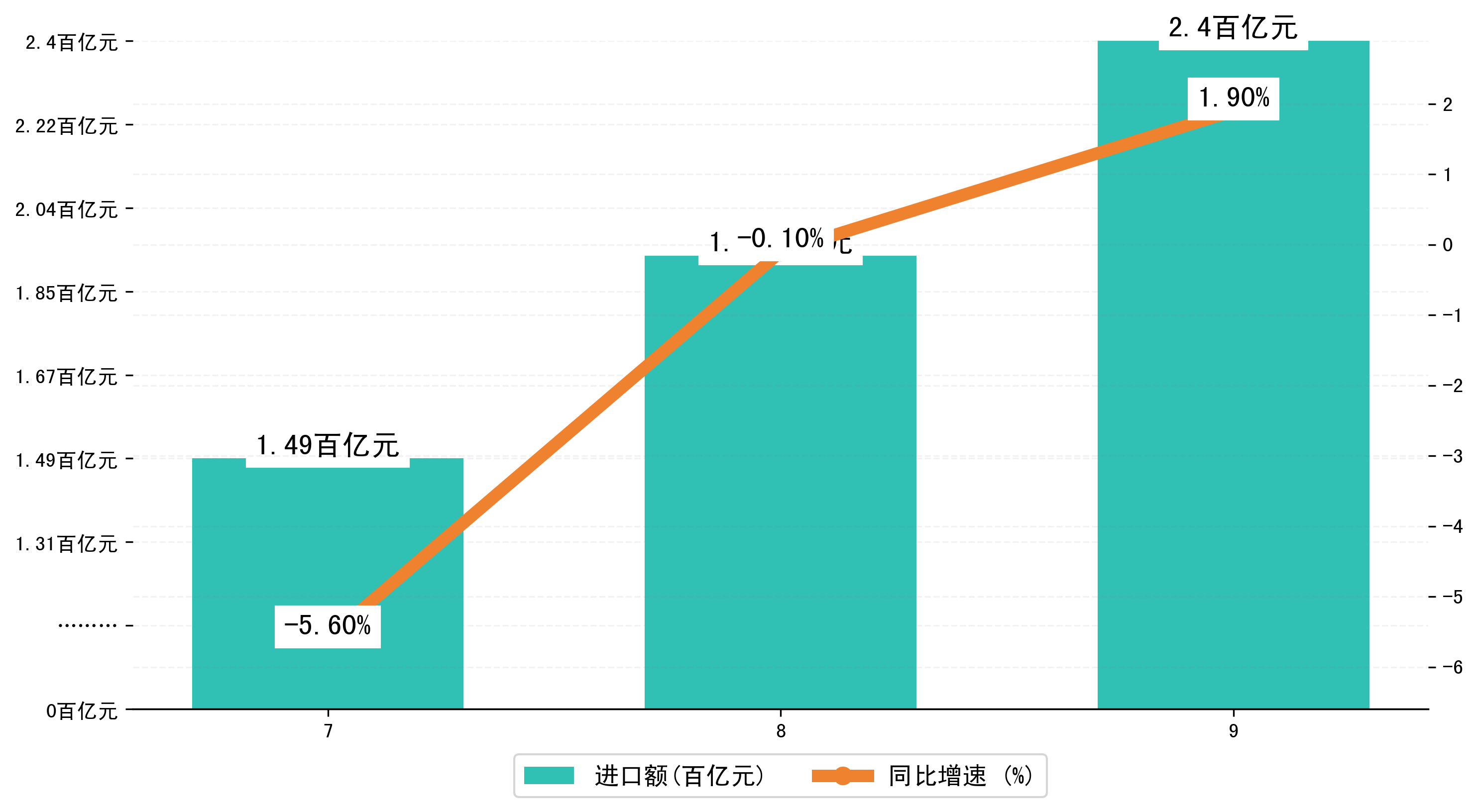 以人民币计,2024年9月郑州市进口额为239,7877.7011万元,相比上月增加了46,6032.5769万元;相比上年同期增加了26,7715.3329万元,同比增加了1.90%。