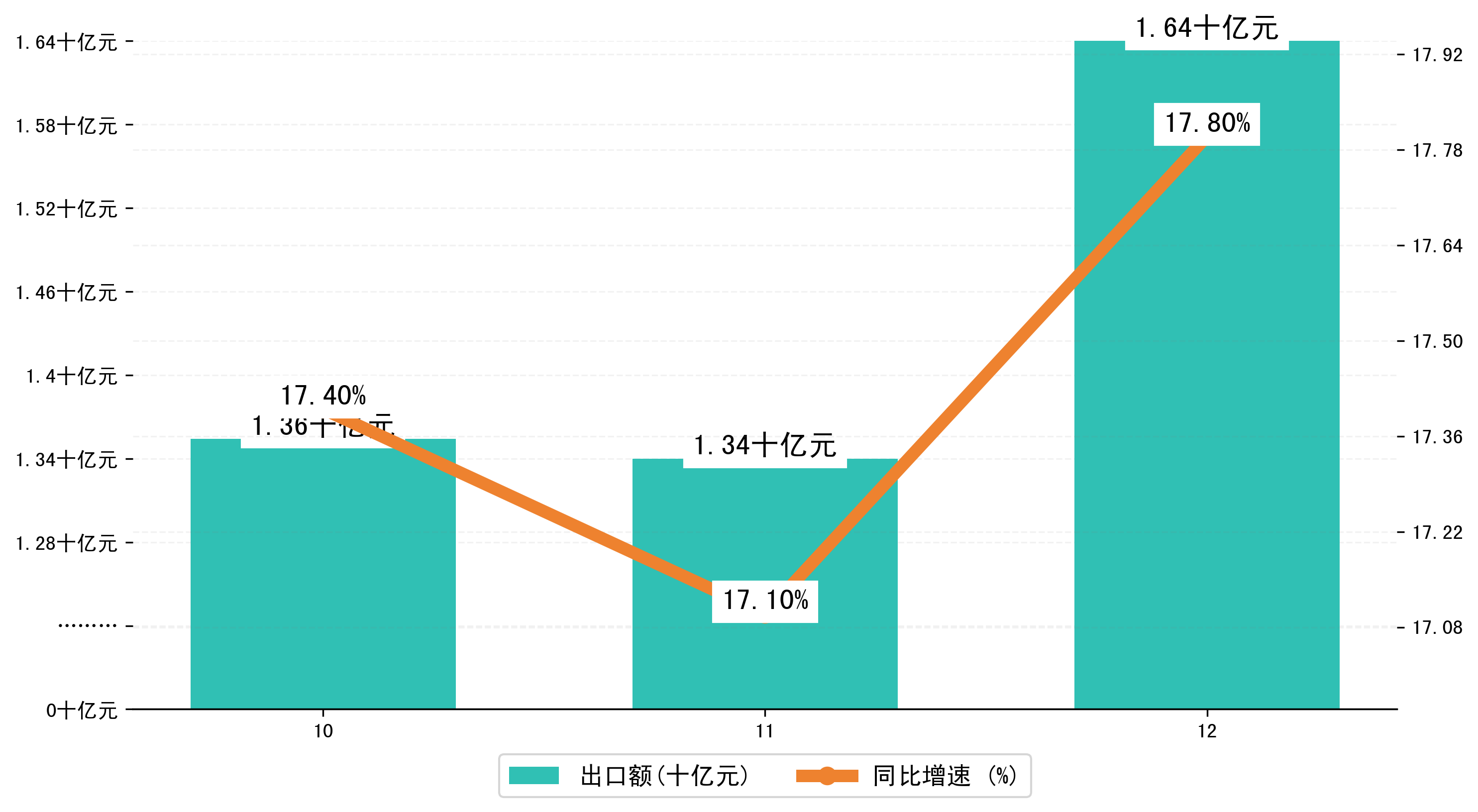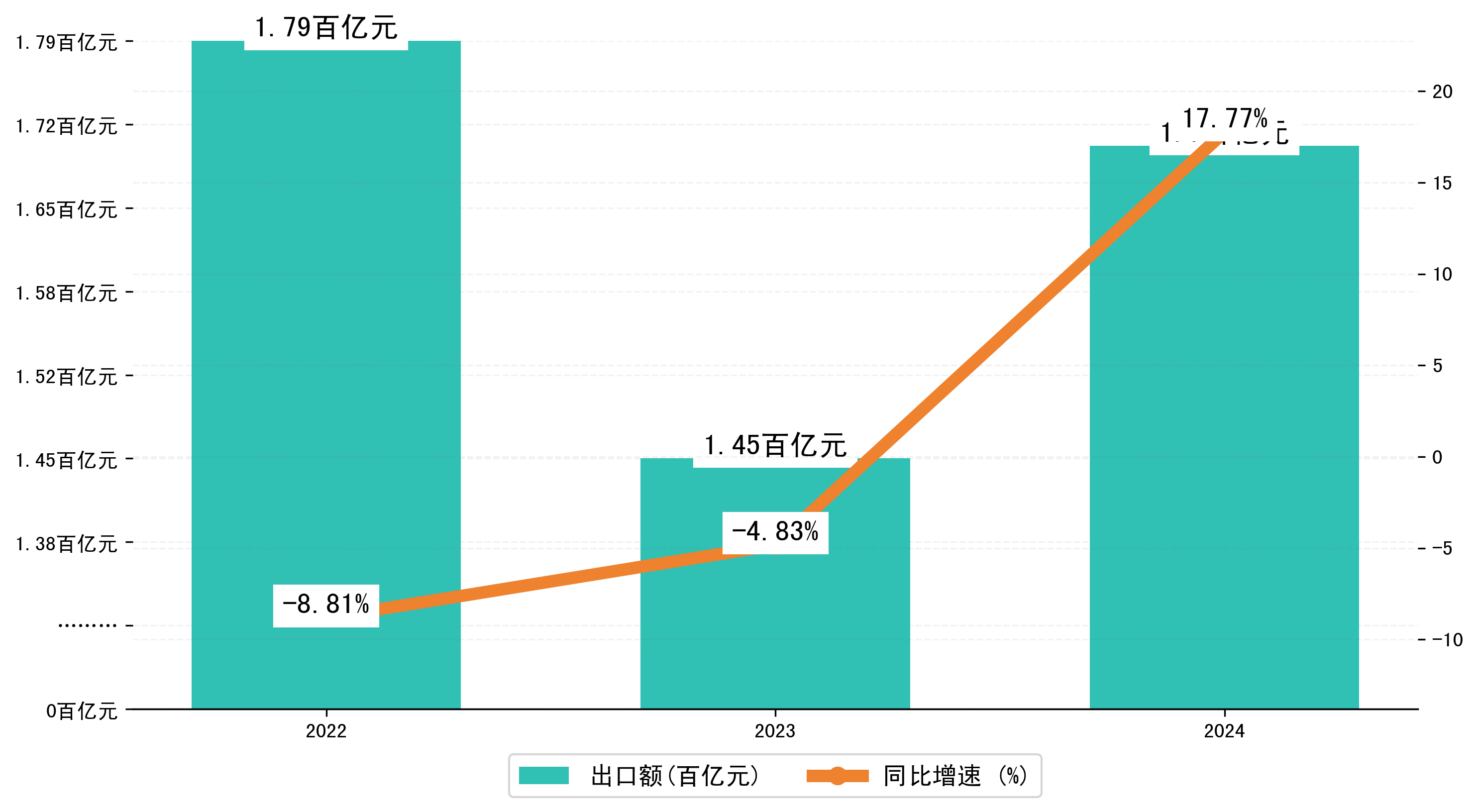 以人民币计,2024年1-12月阳江市出口额为170,3708.8285万元,相比上年同期增加了25,7118.6348万元,同比增加了17.80%。