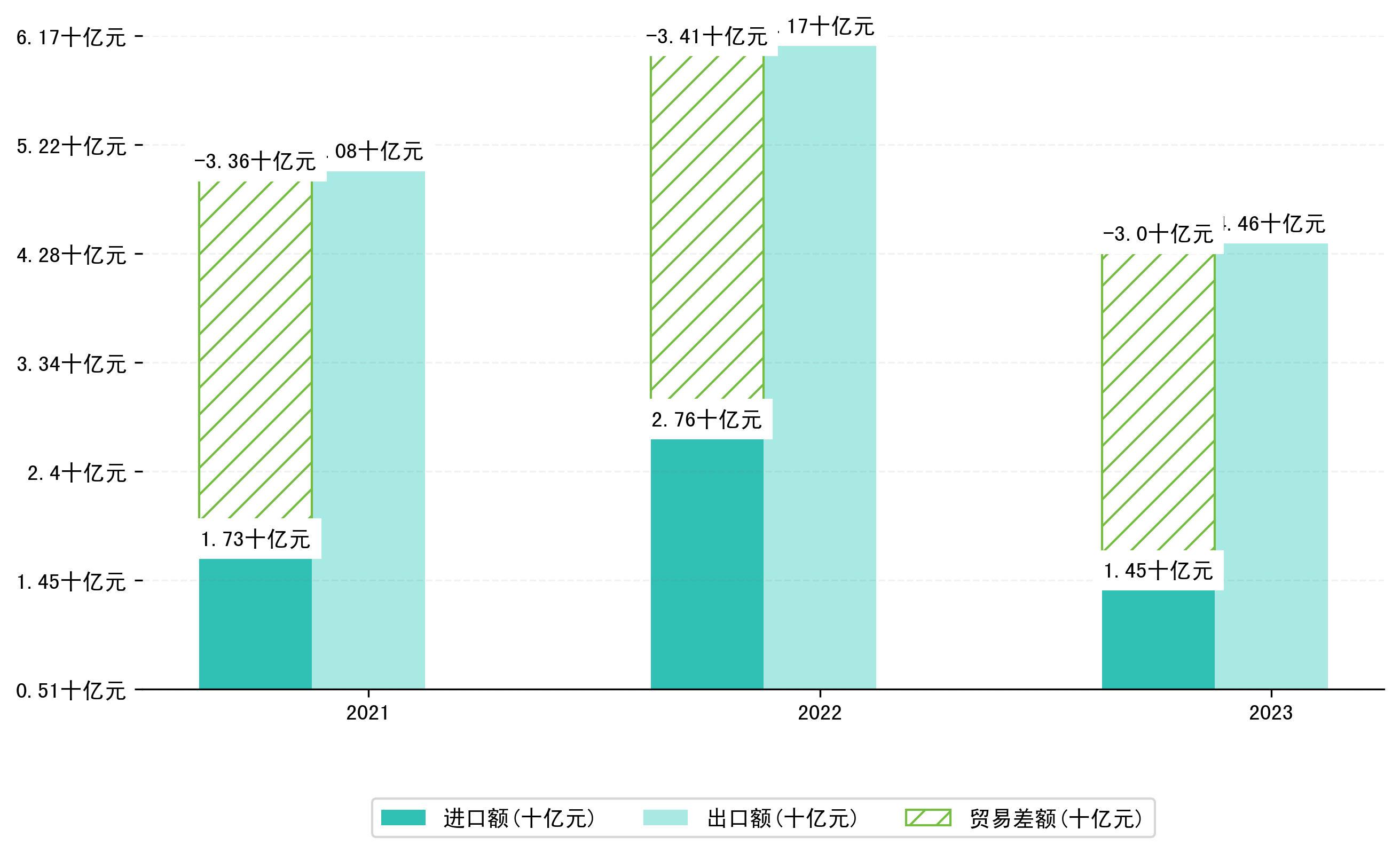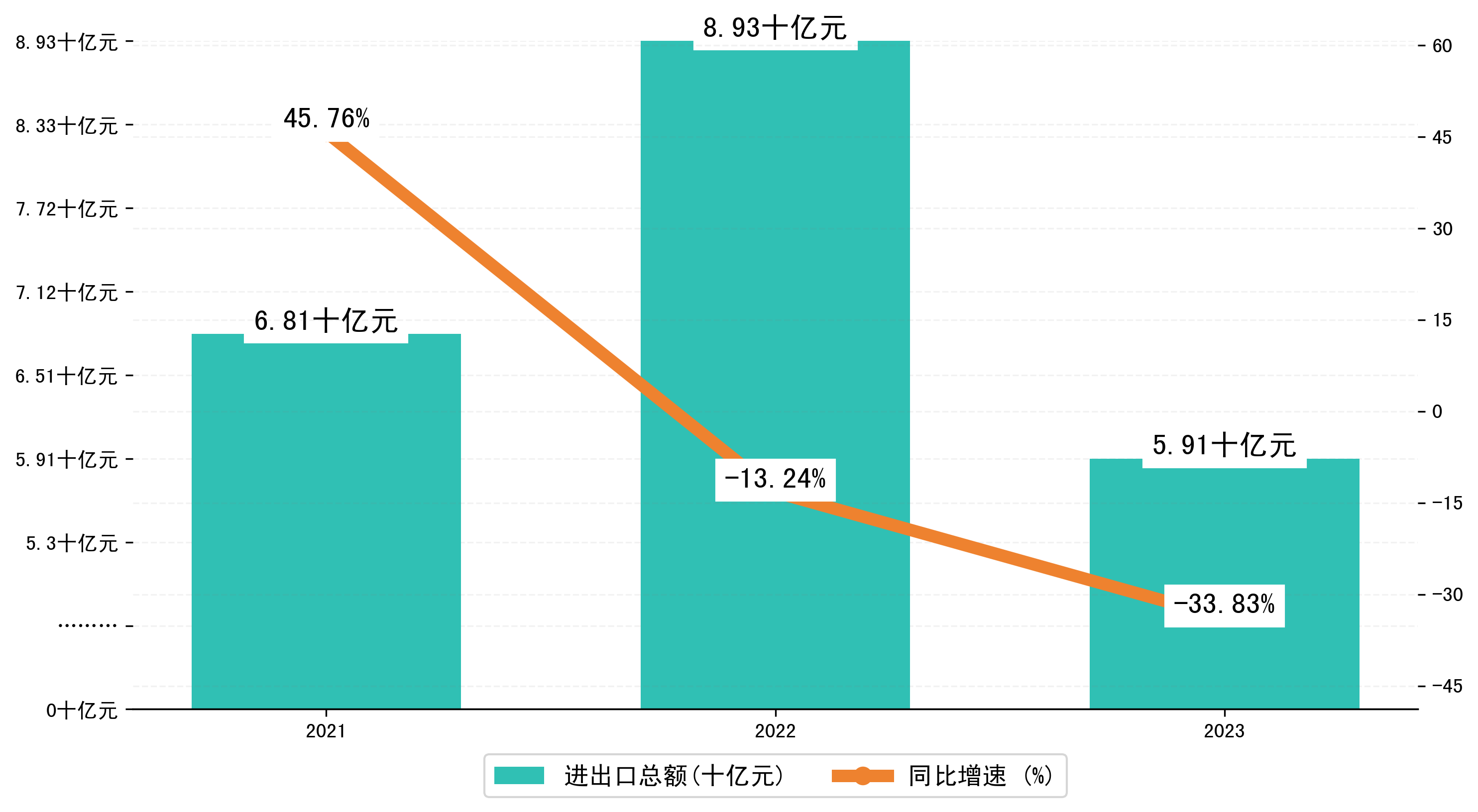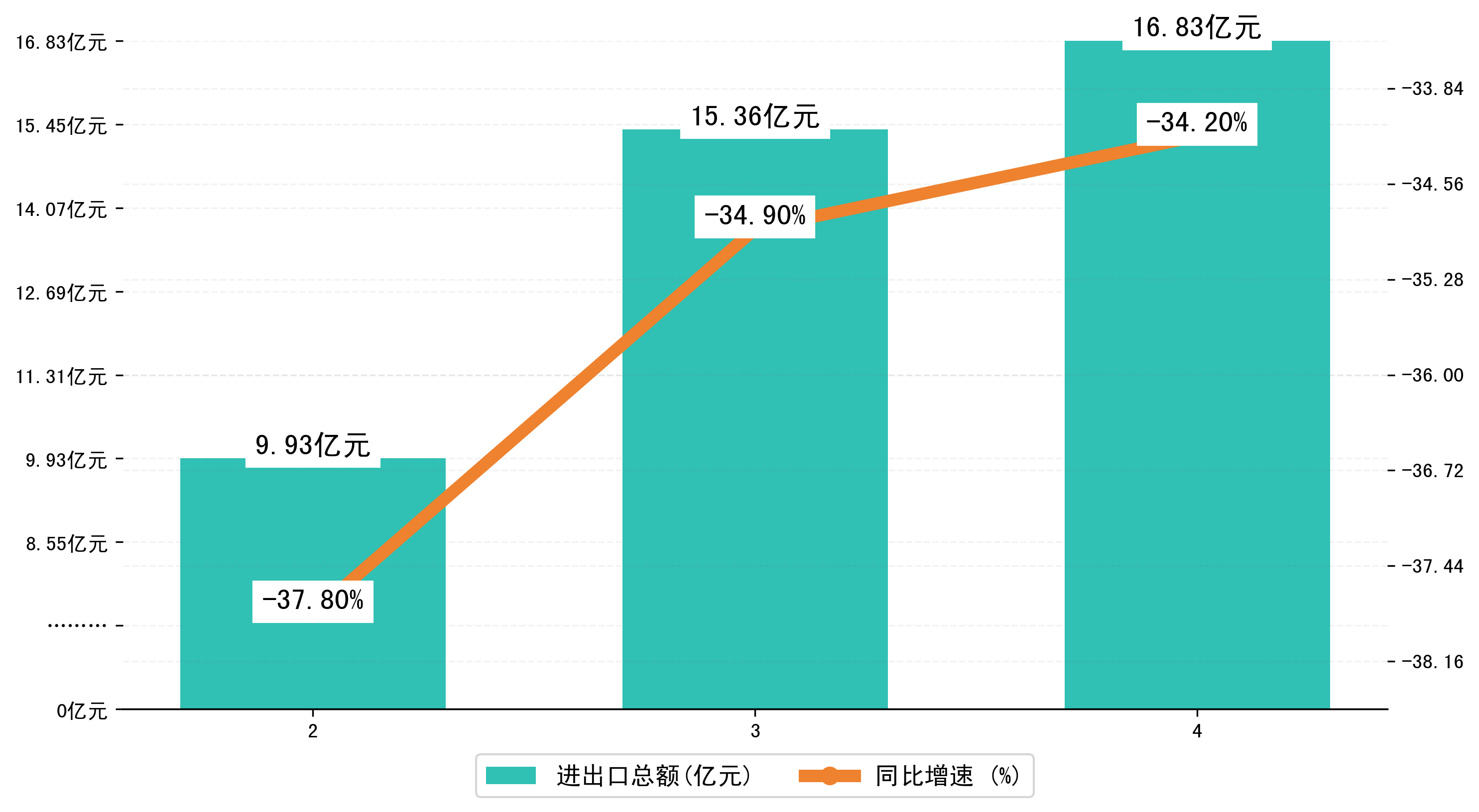 以人民币计,2023年1-4月阳江市贸易差额为30,0308,6130万元(贸易顺差),相比上年同期减少了4,0266,6154万元,同比减少-11.82%。