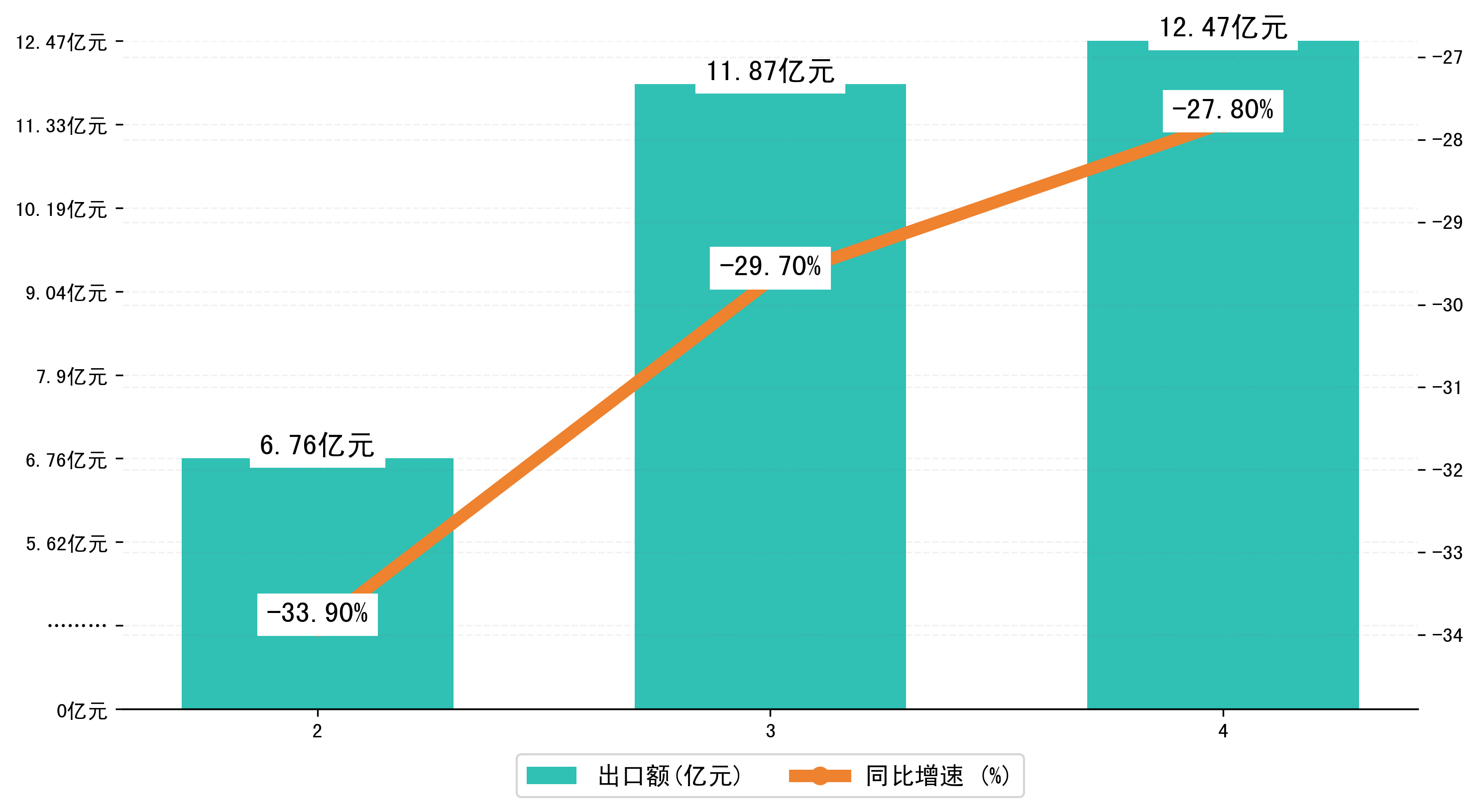 以美元计,2023年1-4月阳江市出口额为6,4822.1889万美元,相比上年同期减少了3,2046.0417万美元,同比减少-33.10%。