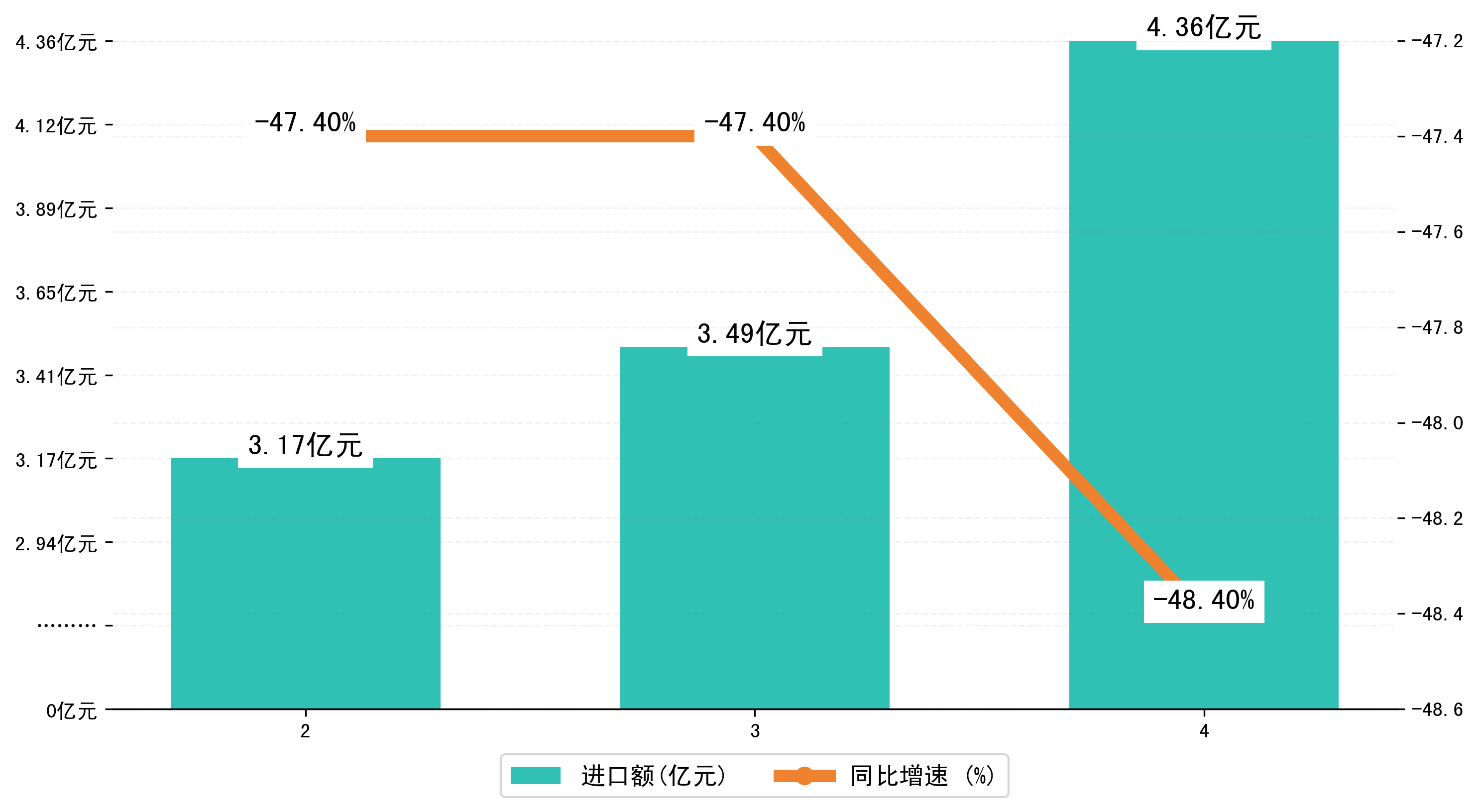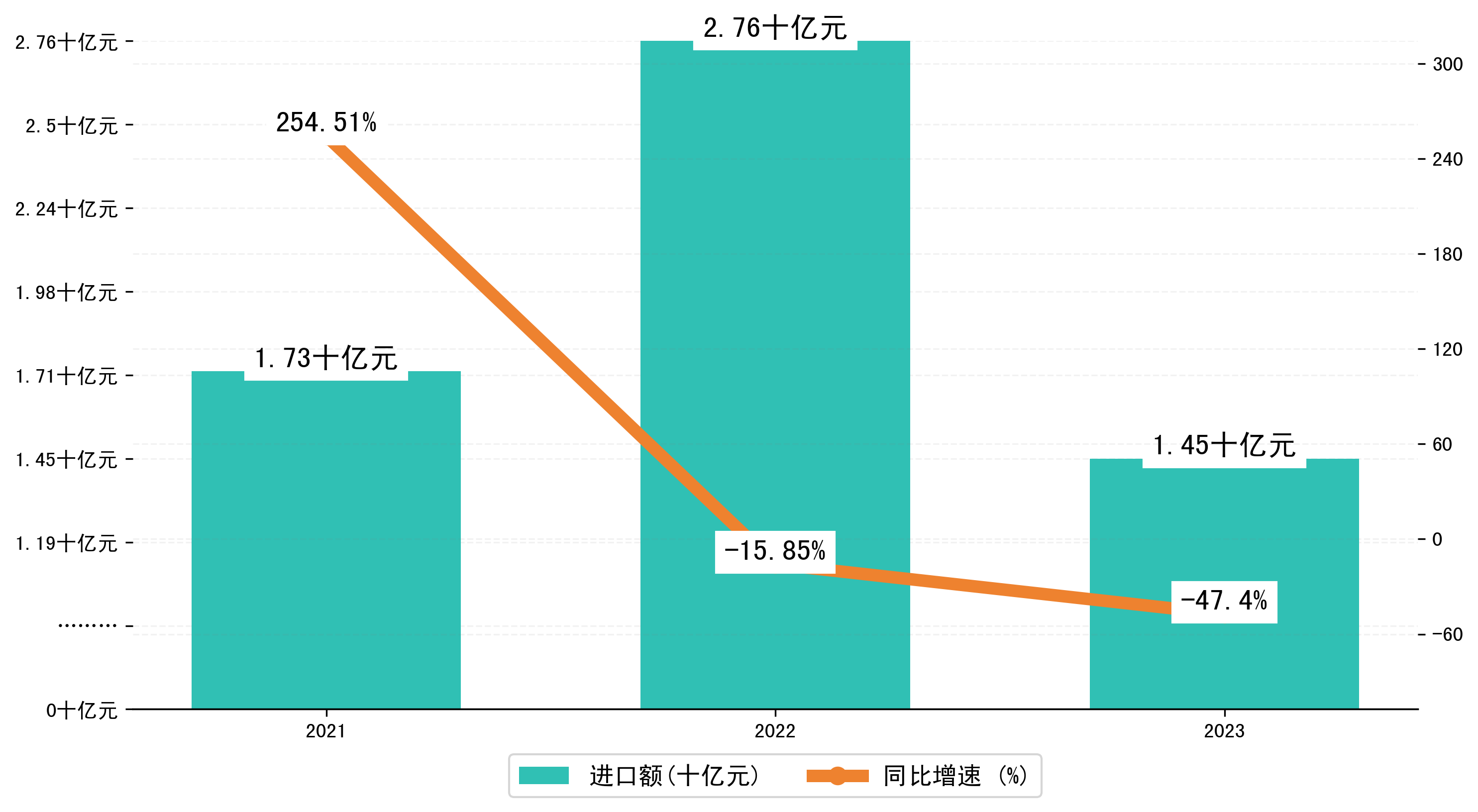 以人民币计,2023年1-4月阳江市进口额为14,5275.4202万元,相比上年同期减少了13,0912.5558万元,同比减少了-48.40%。