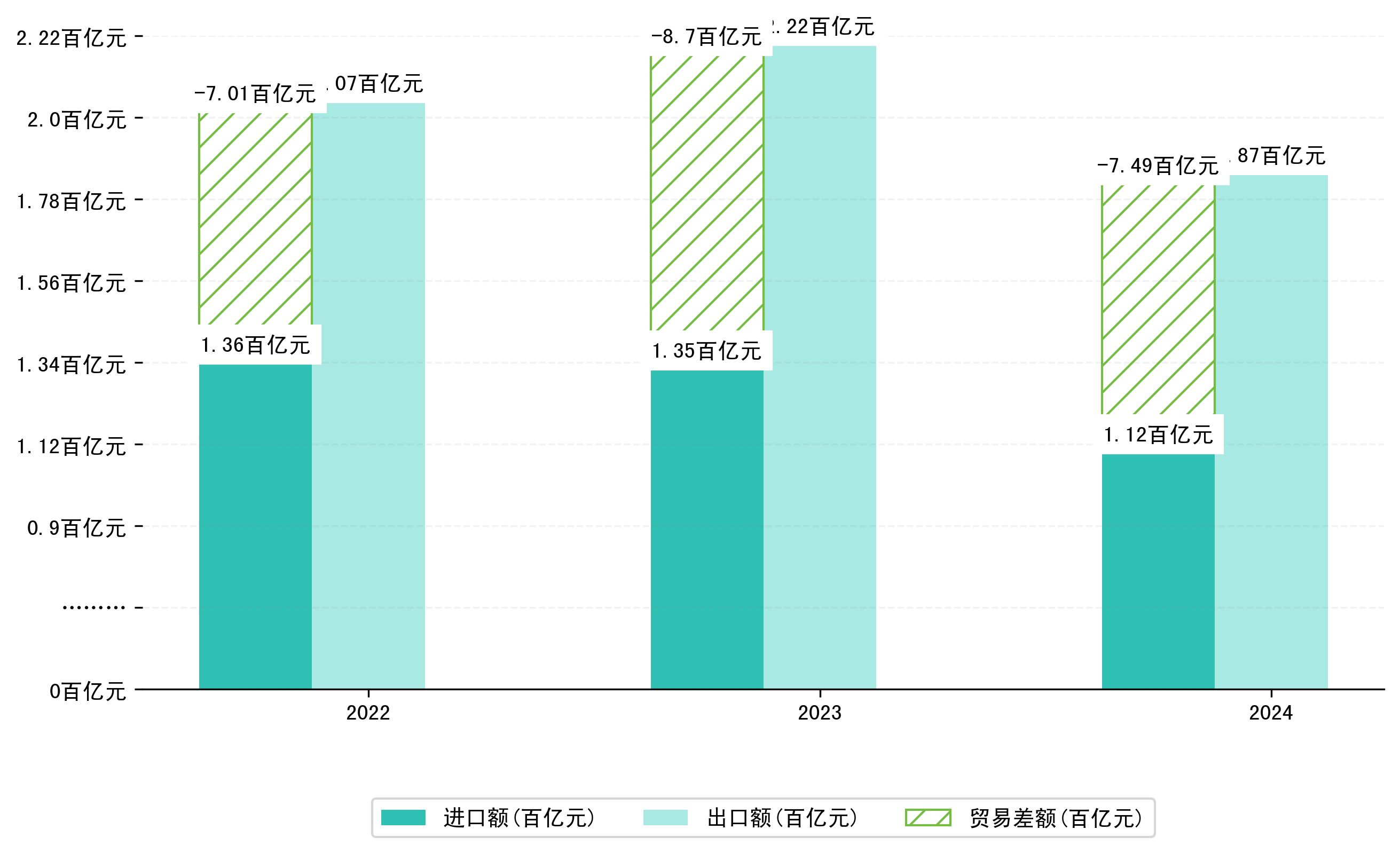 以人民币计,2024年1月烟台市贸易差额为74,9095,0233万元(贸易顺差),相比上月增加了55,9388,1093万元,即7,8454,9333万美元;相比上年同期减少了12,0809,2659万元,同比减少-13.89%。
