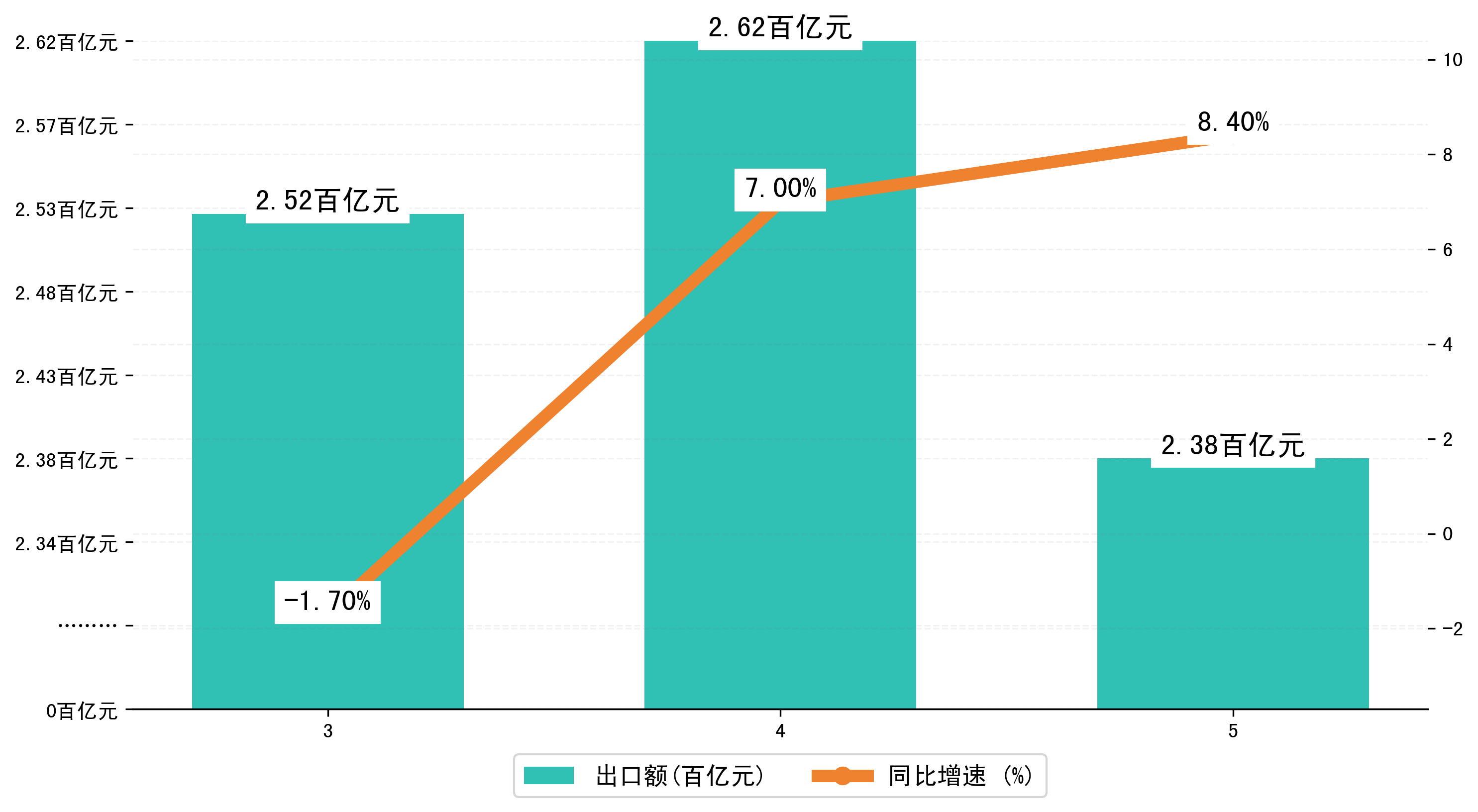 以人民币计,2025年5月烟台市出口额为238,3927.183万元,相比上月减少了23,6100.5203万元;相比上年同期增加了30,0928.5848万元,同比增加了8.40%。