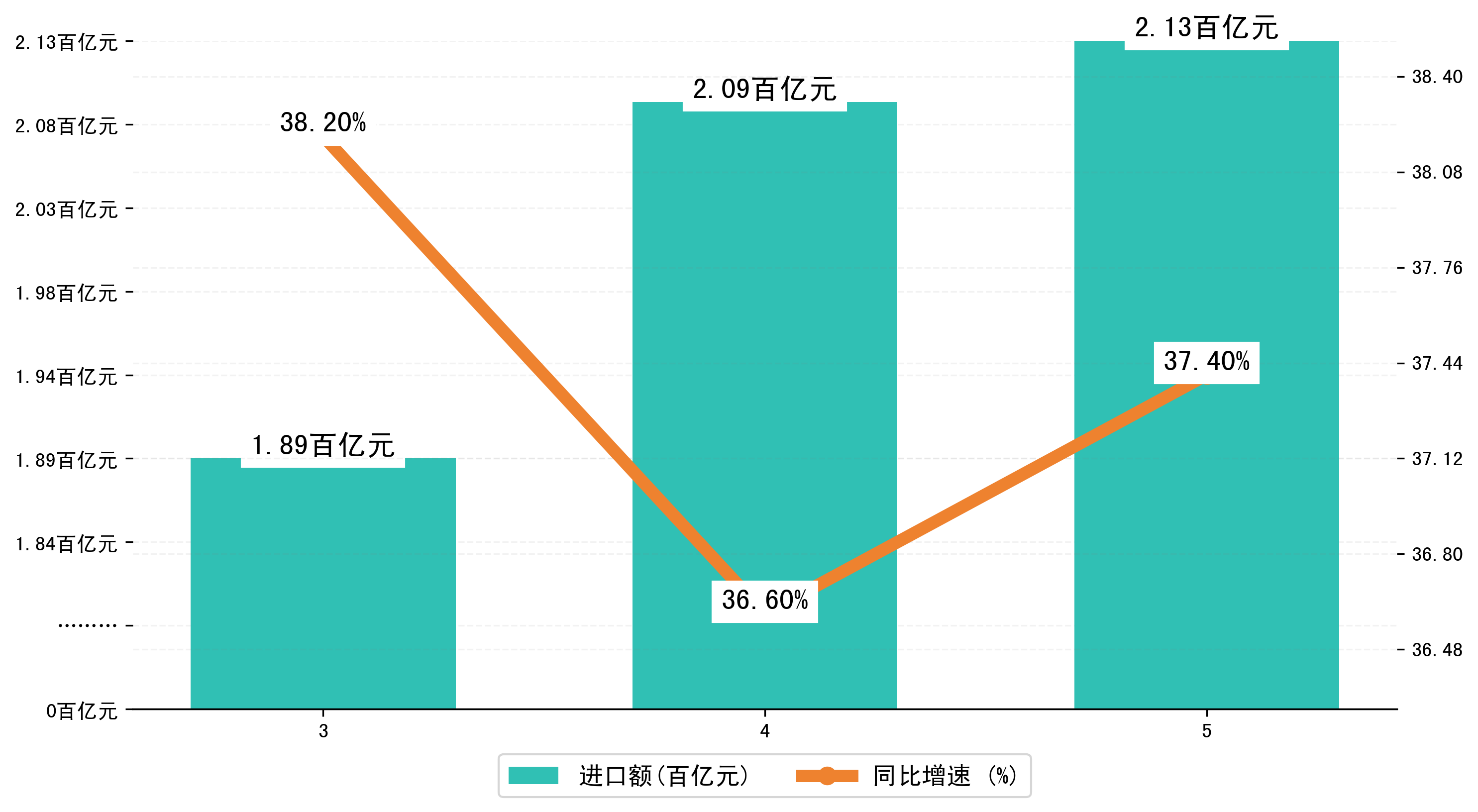 以人民币计,2025年5月烟台市进口额为212,7143.8259万元,相比上月增加了3,5041.3321万元;相比上年同期增加了62,1962.1329万元,同比增加了37.40%。