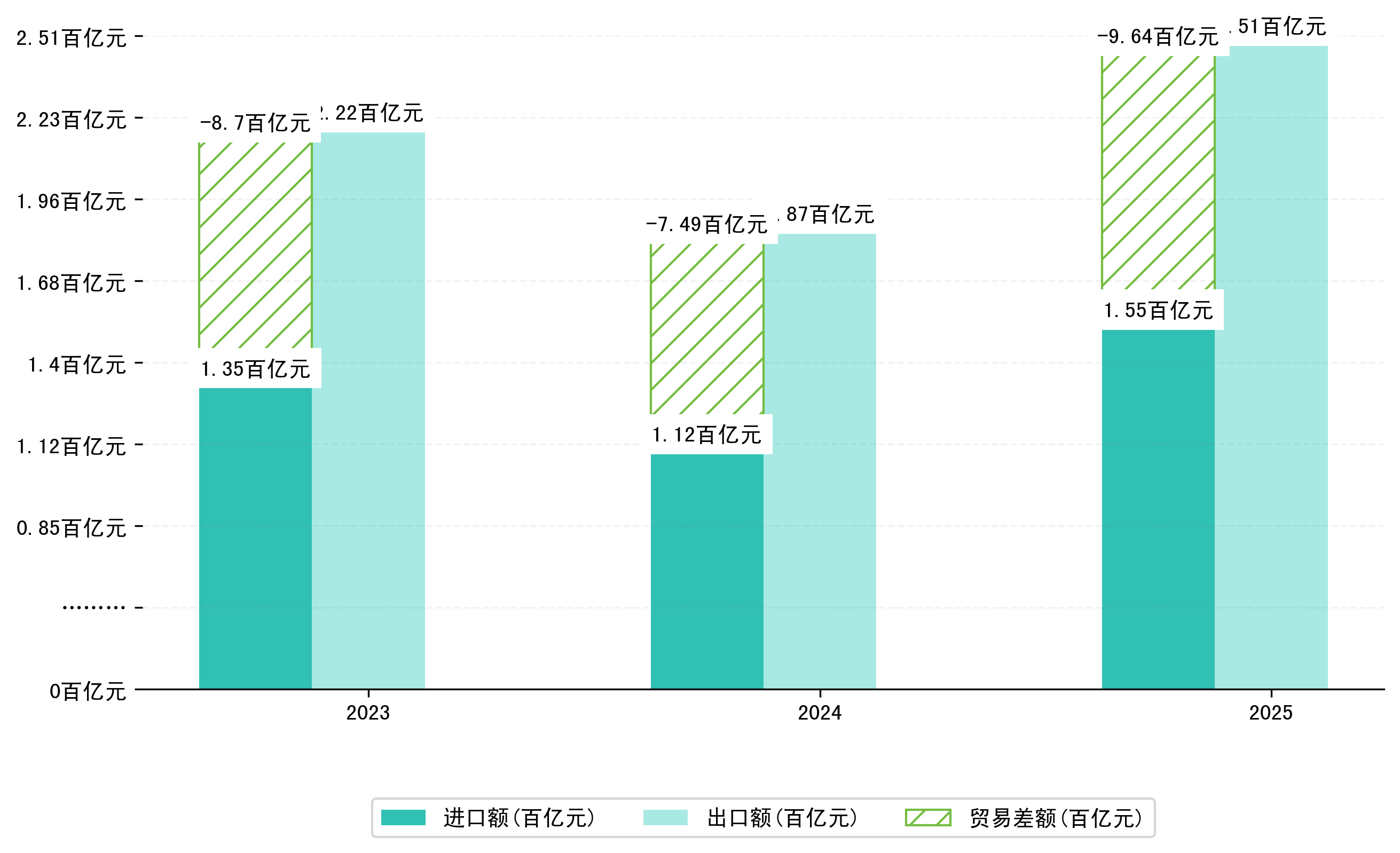 以人民币计,2025年1月烟台市贸易差额为96,3655,4594万元(贸易顺差),相比上月增加了66,2008,5363万元,即9,2160,9116万美元;相比上年同期增加了21,4560,4361万元,同比增加28.64%。