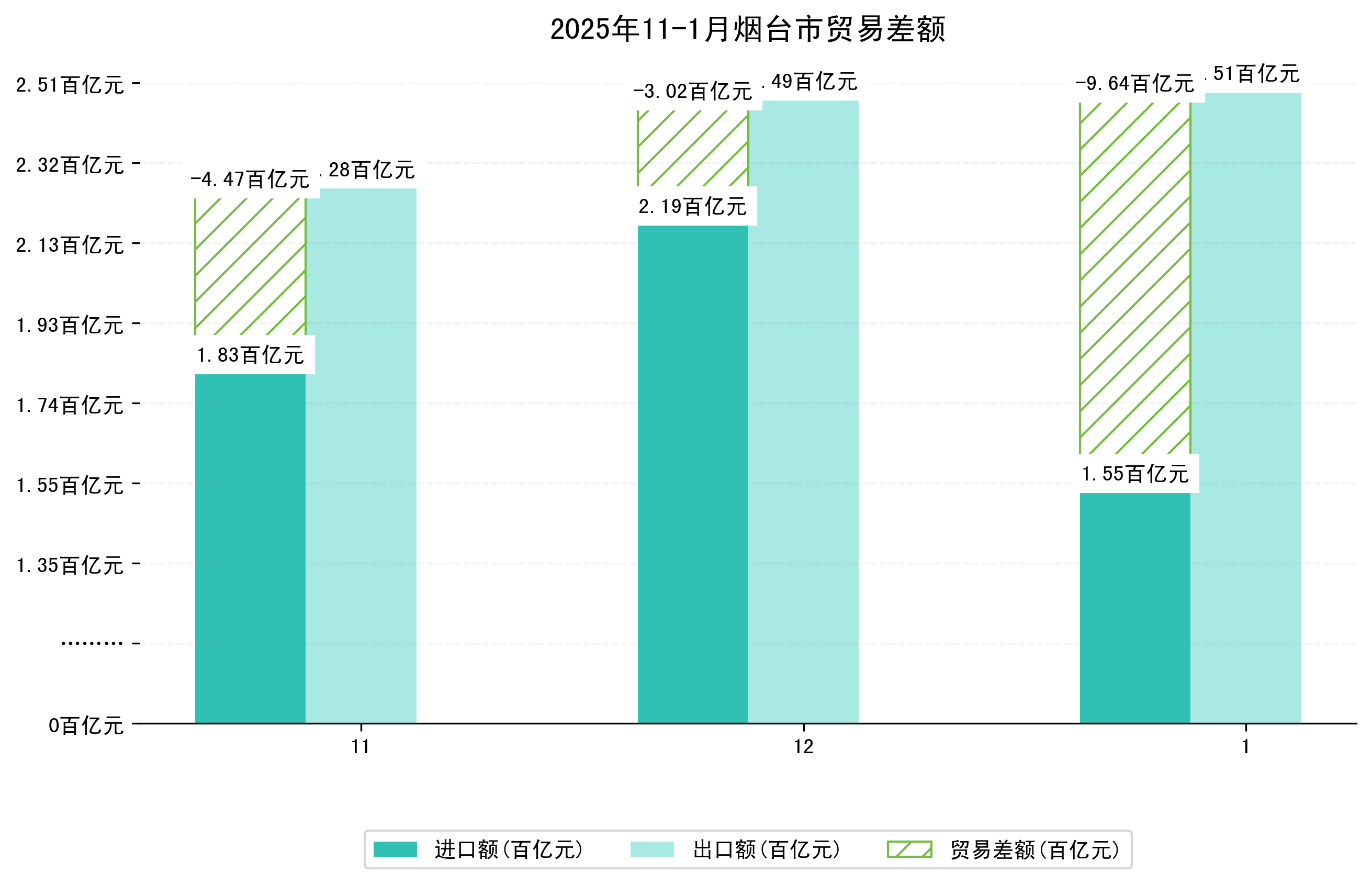 以人民币计,2025年1-1月烟台市贸易差额为96,3655,4594万元(贸易顺差),相比上年同期增加了21,4560,4361万元,同比增加28.64%。