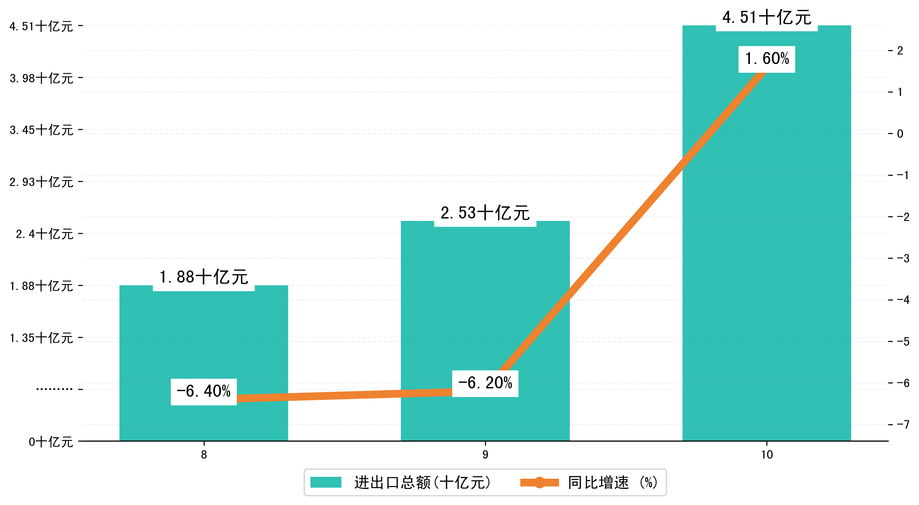 以人民币计,2024年10月宜宾市进出口总额为45,0553.8634万元,相比上月增加了19,7813.1386万元;相比上年同期增加了16,7250.259万元,同比增加了1.60%。